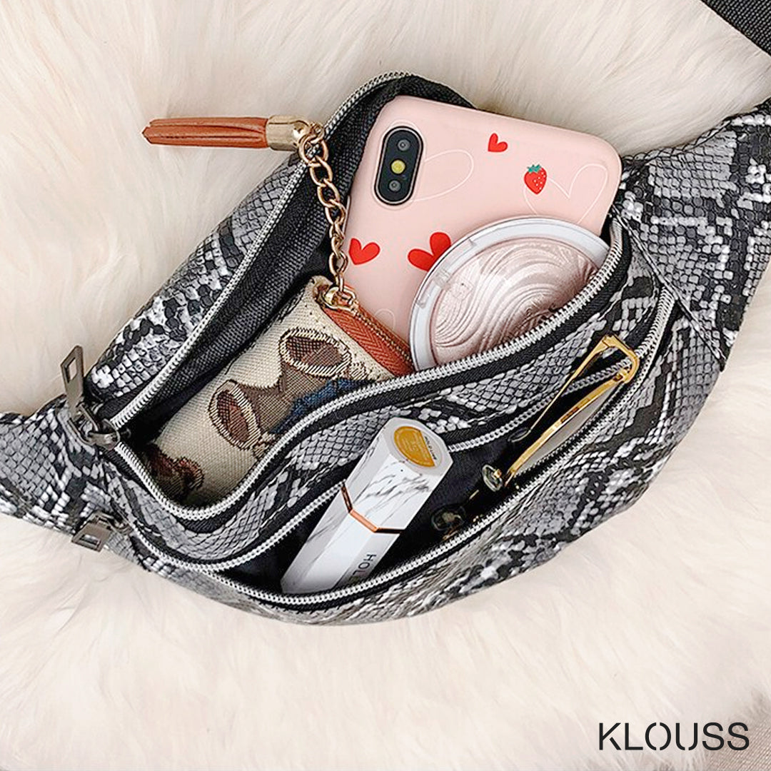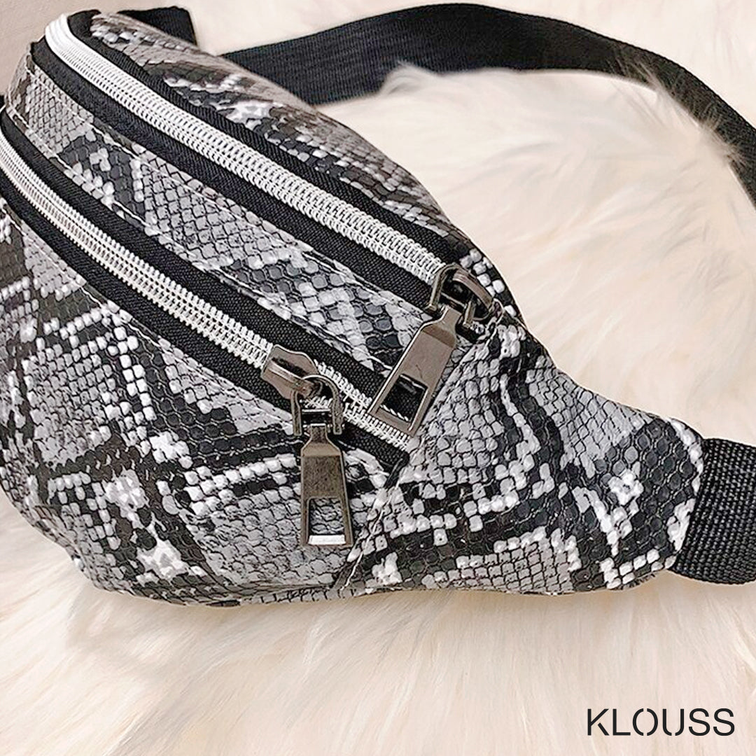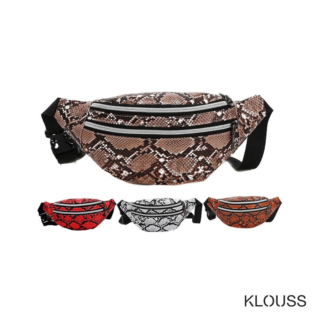 Taquillero banano de textura de cuero de serpiente en 5 lindos colores. Con 2 bolsillos con cierre metálico. ¡Te va a encantar!