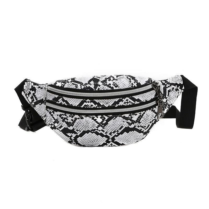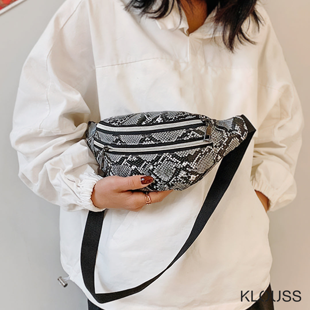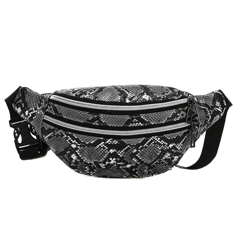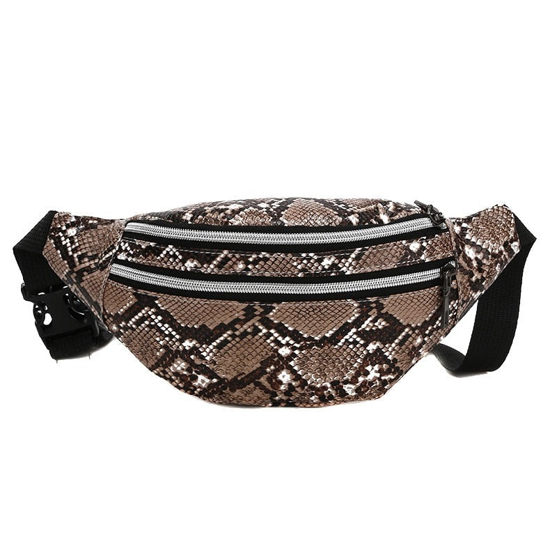 Taquillero banano de textura de cuero de serpiente en 5 lindos colores. Con 2 bolsillos con cierre metálico. ¡Te va a encantar!