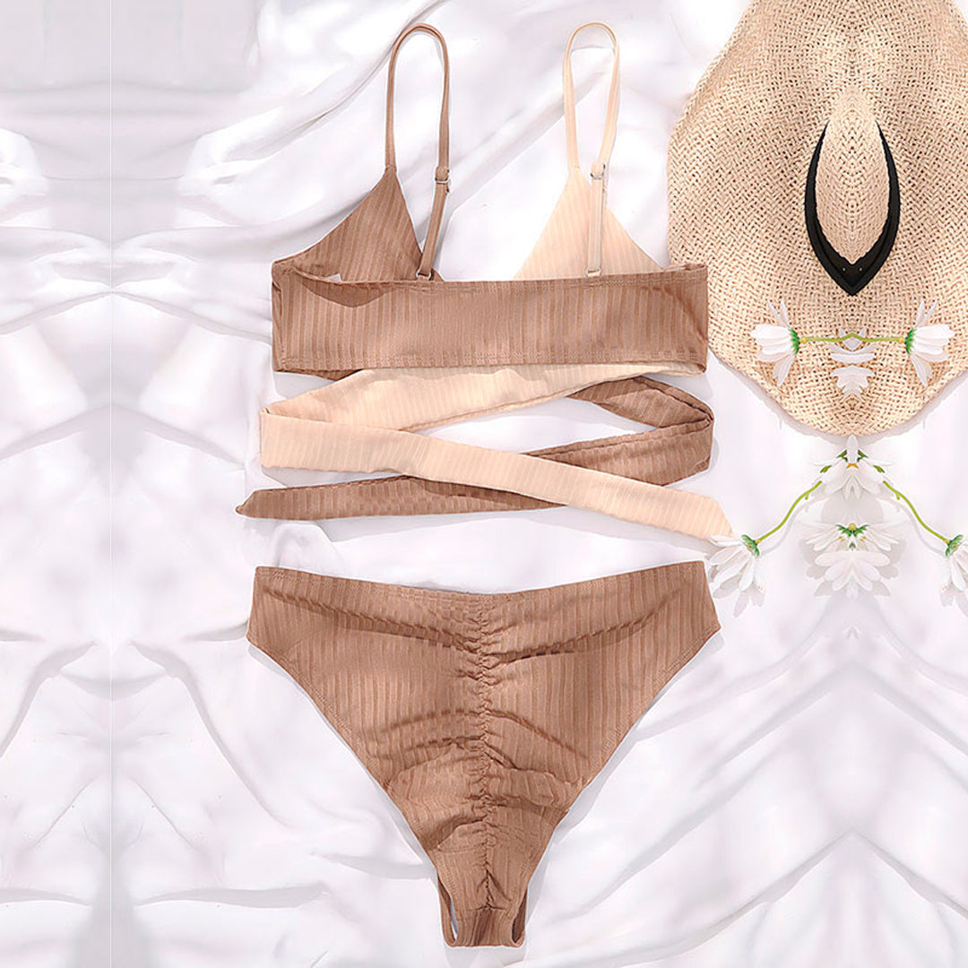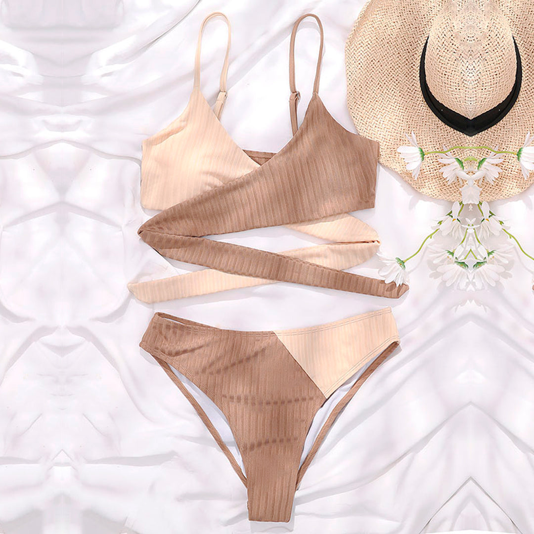 Precioso Bikini cruzado para mujer de textura acanalada con un nudo en la espalda y de tiro alto ¡Te vas a ver estupenda!