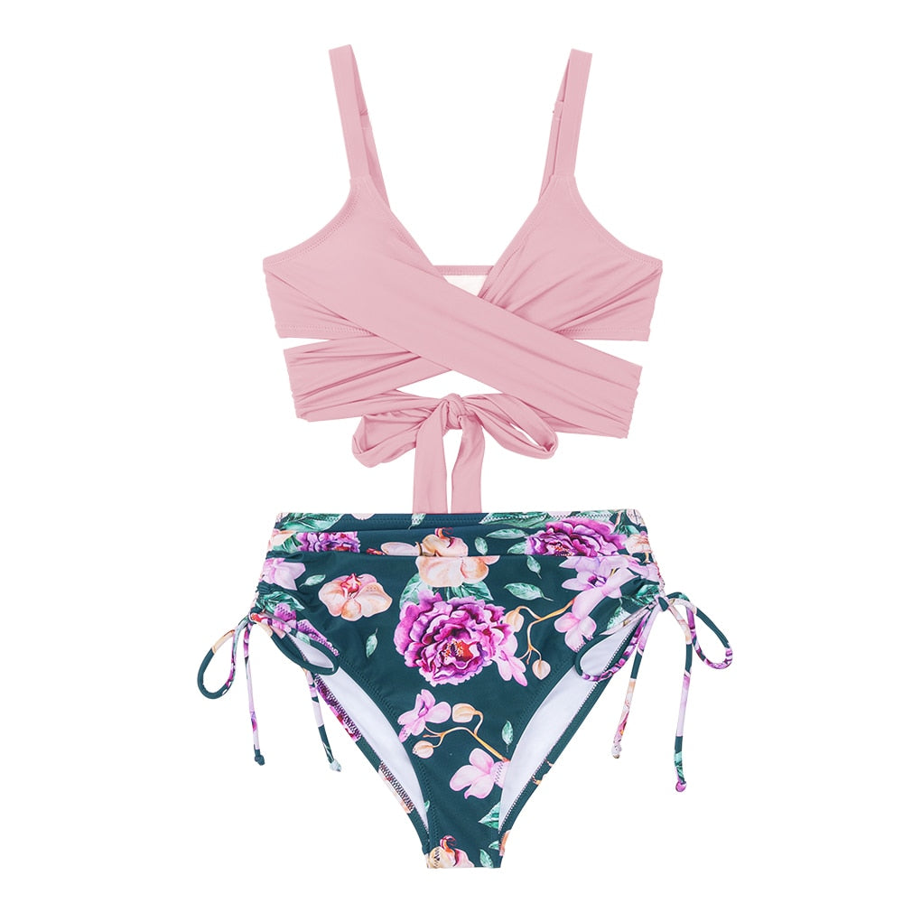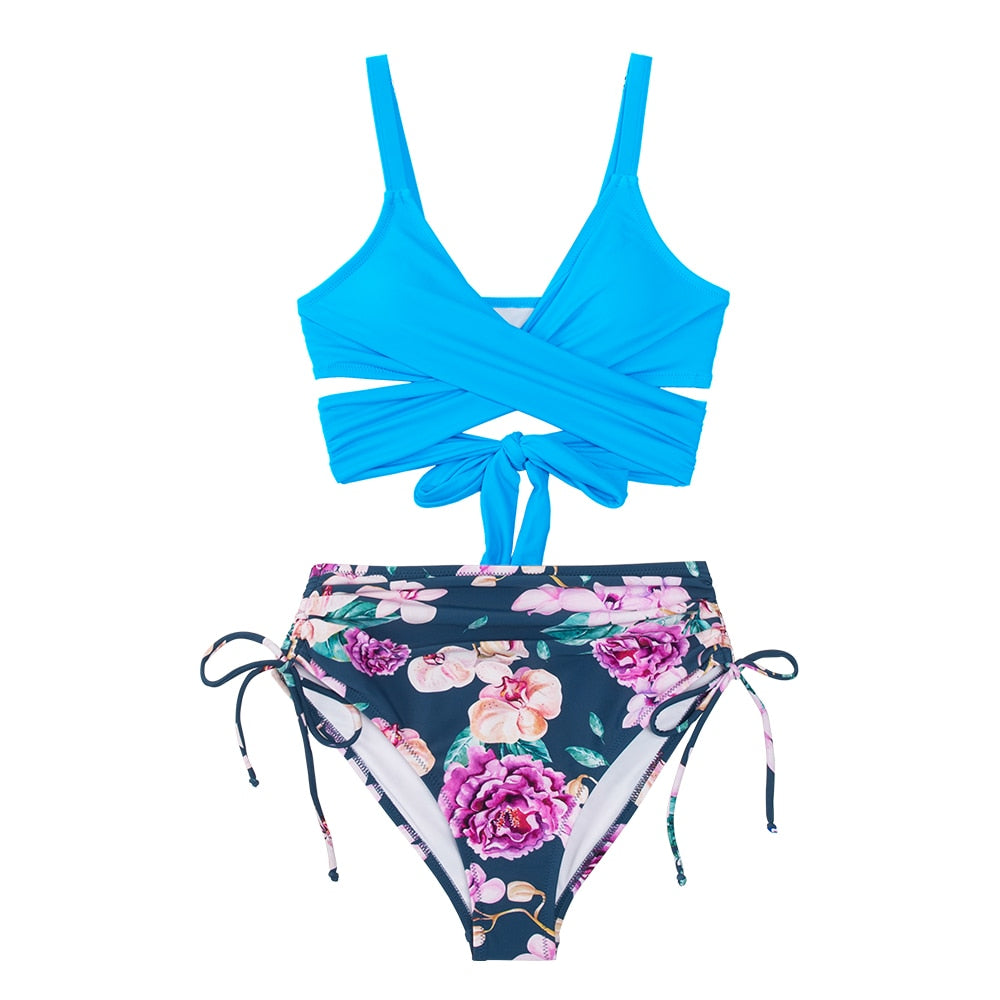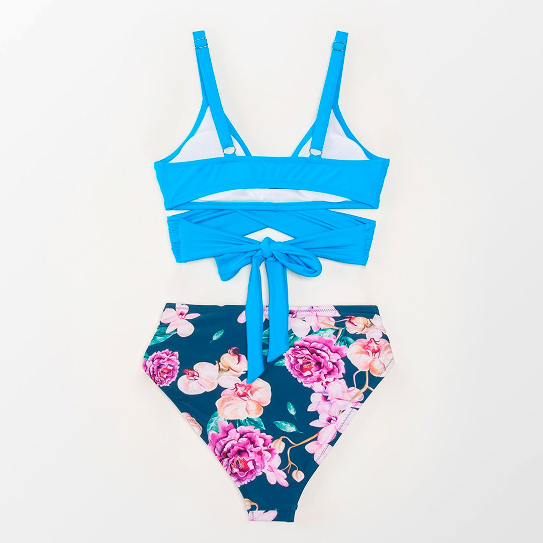 Precioso conjunto de Bikini para mujer de cintura alta y estampado de flores y top de diseño de color plano cruzado con realce. ¡Te vas a ver estupenda!