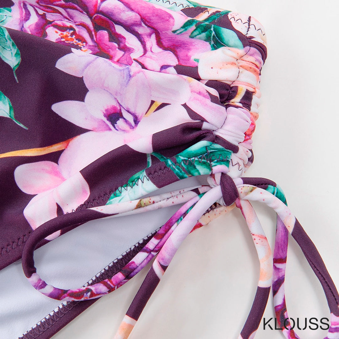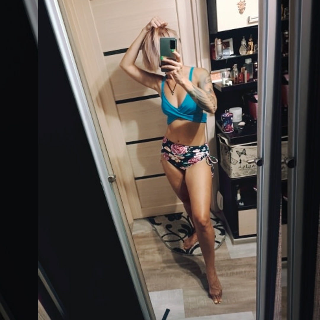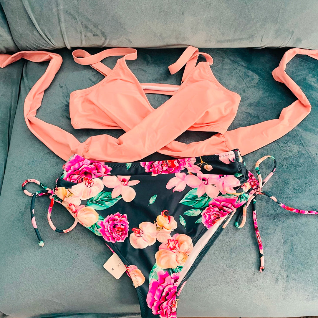 Precioso conjunto de Bikini para mujer de cintura alta y estampado de flores y top de diseño de color plano cruzado con realce. ¡Te vas a ver estupenda!