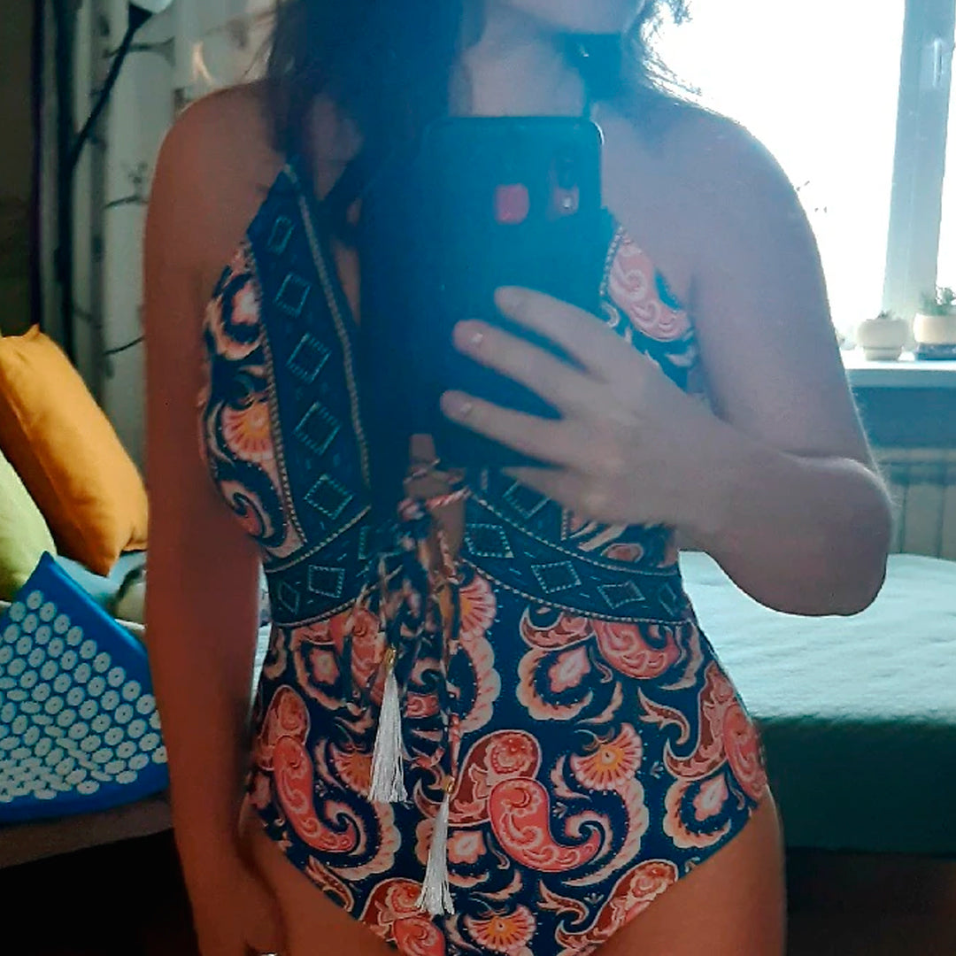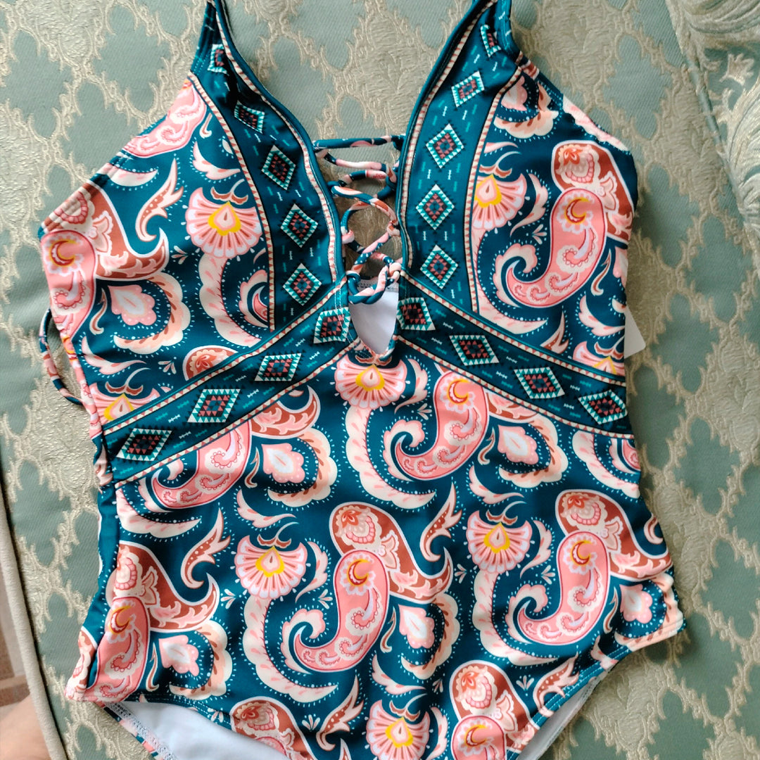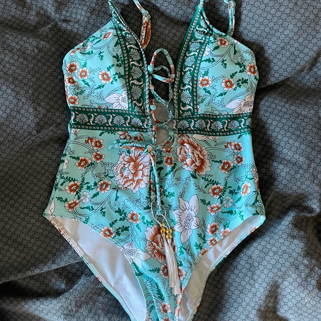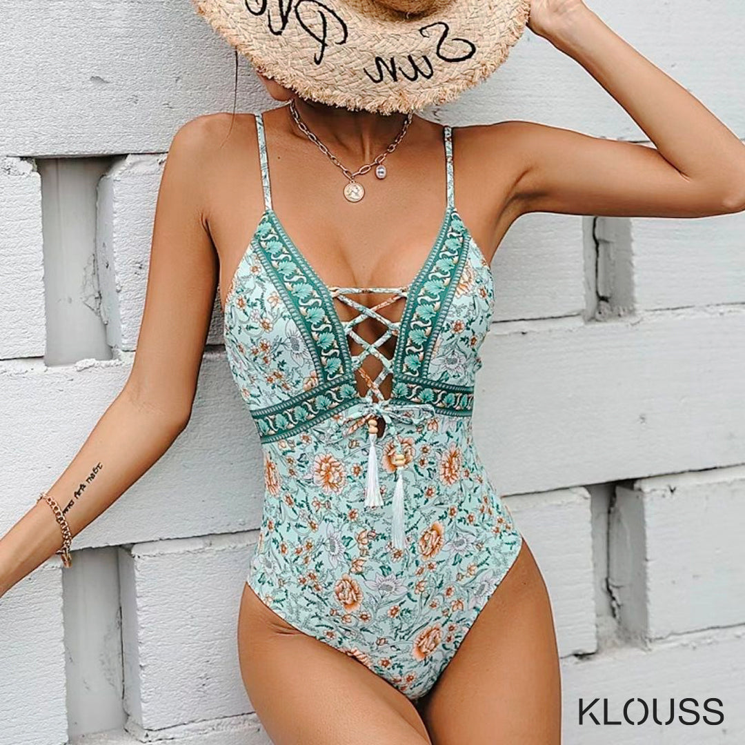 Precioso traje de baño con realce y escote con amarres. Diseñado con texturas primaverales. ¡Te va a encantar!