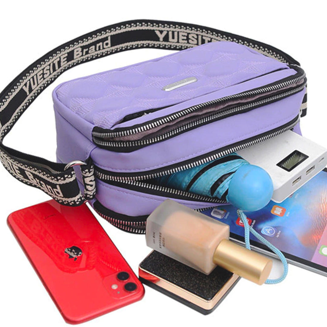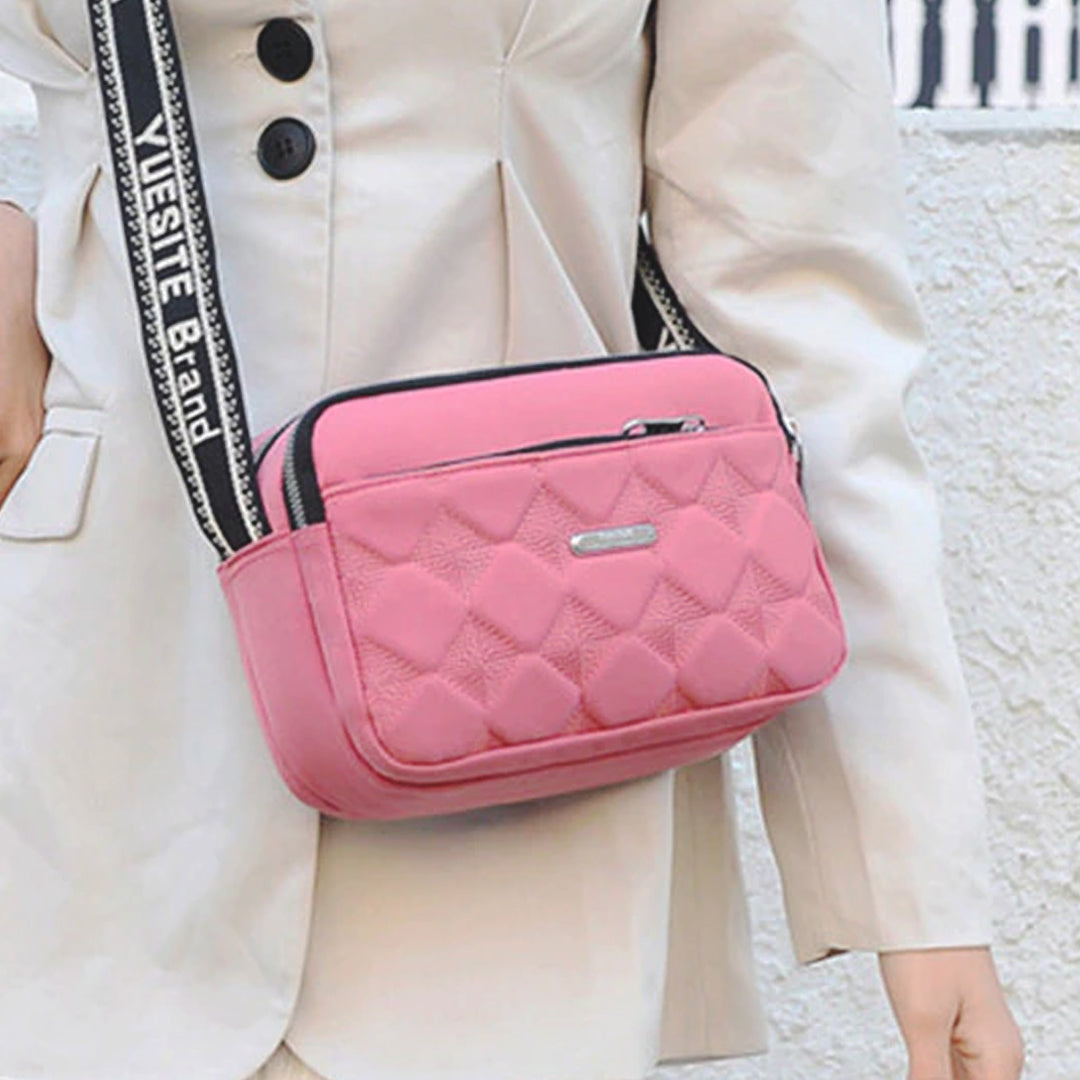 Linda bandolera de Nylon diseñada con colores planos y textura acolchada. Cuenta con 4 bolsillos y correa ajustable ¡Demasiado taquillera!