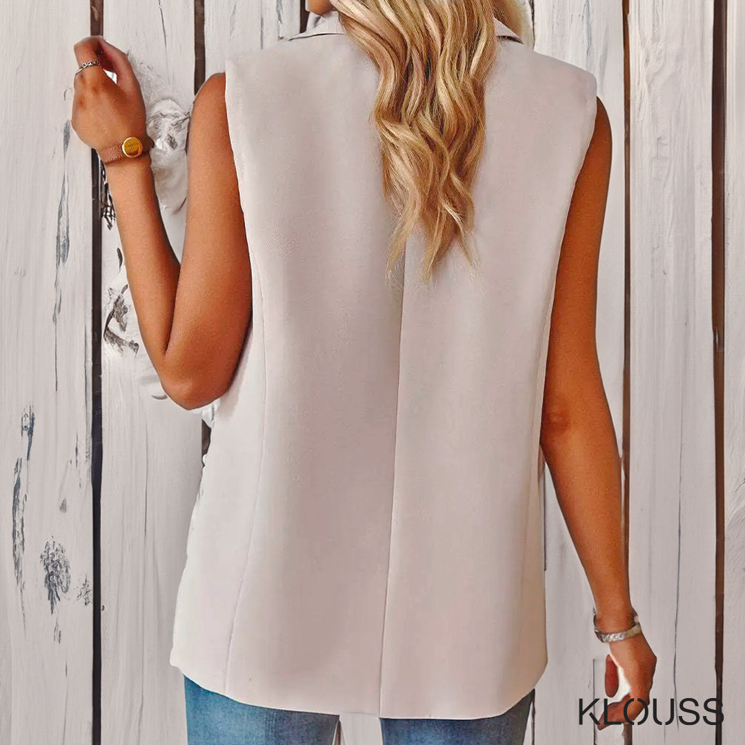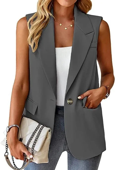 Lindo blazer para mujer sin mangas informal con botones y cuello en "V". Disponible en 9 lindos colores planos. Ideal para la oficina o la noche. ¡Te vas a ver regia!