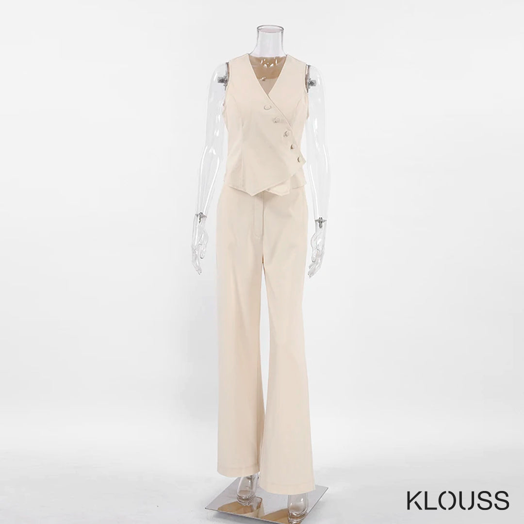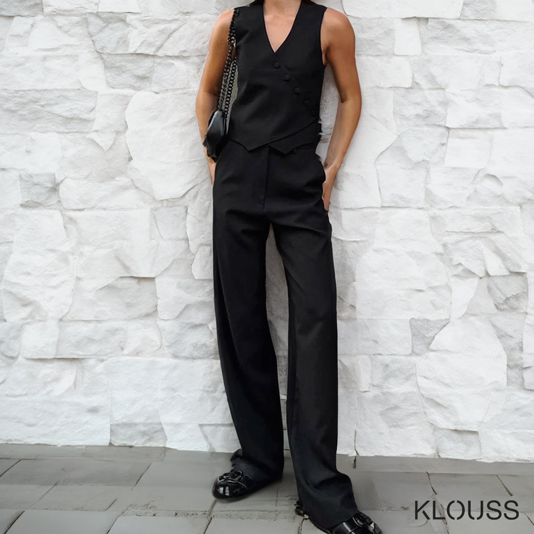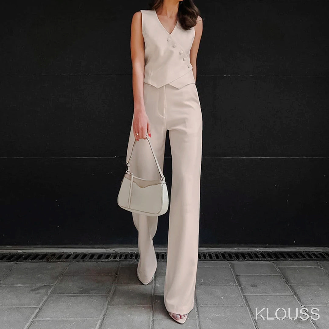 Conjunto de dos piezas para mujer con top tipo vest con botones cruzados y cuello en "v" y pantalones largos de pierna ancha. Ideal para la oficina ¡Te vas a ver regia! Disponible en blanco y negro.