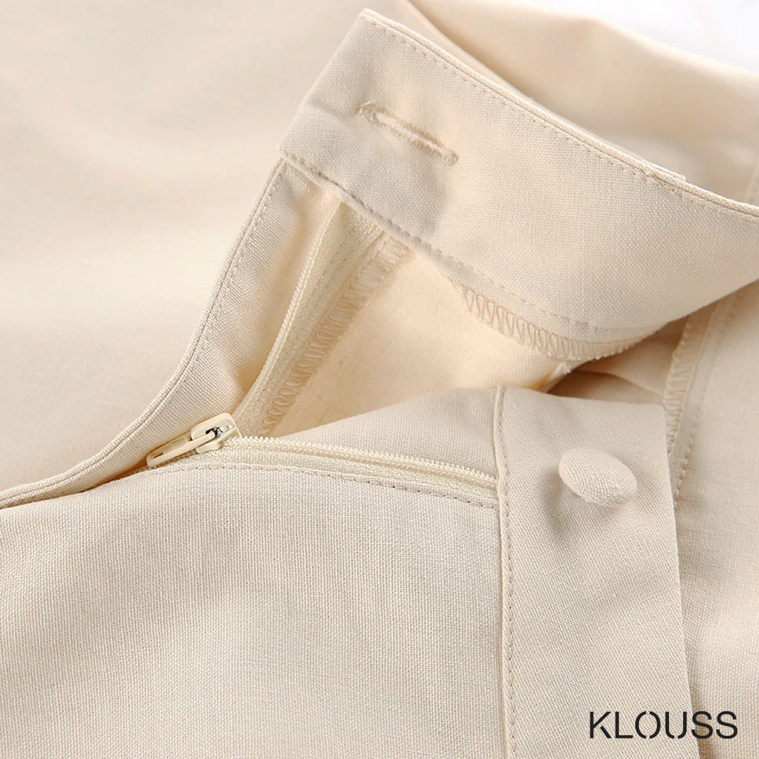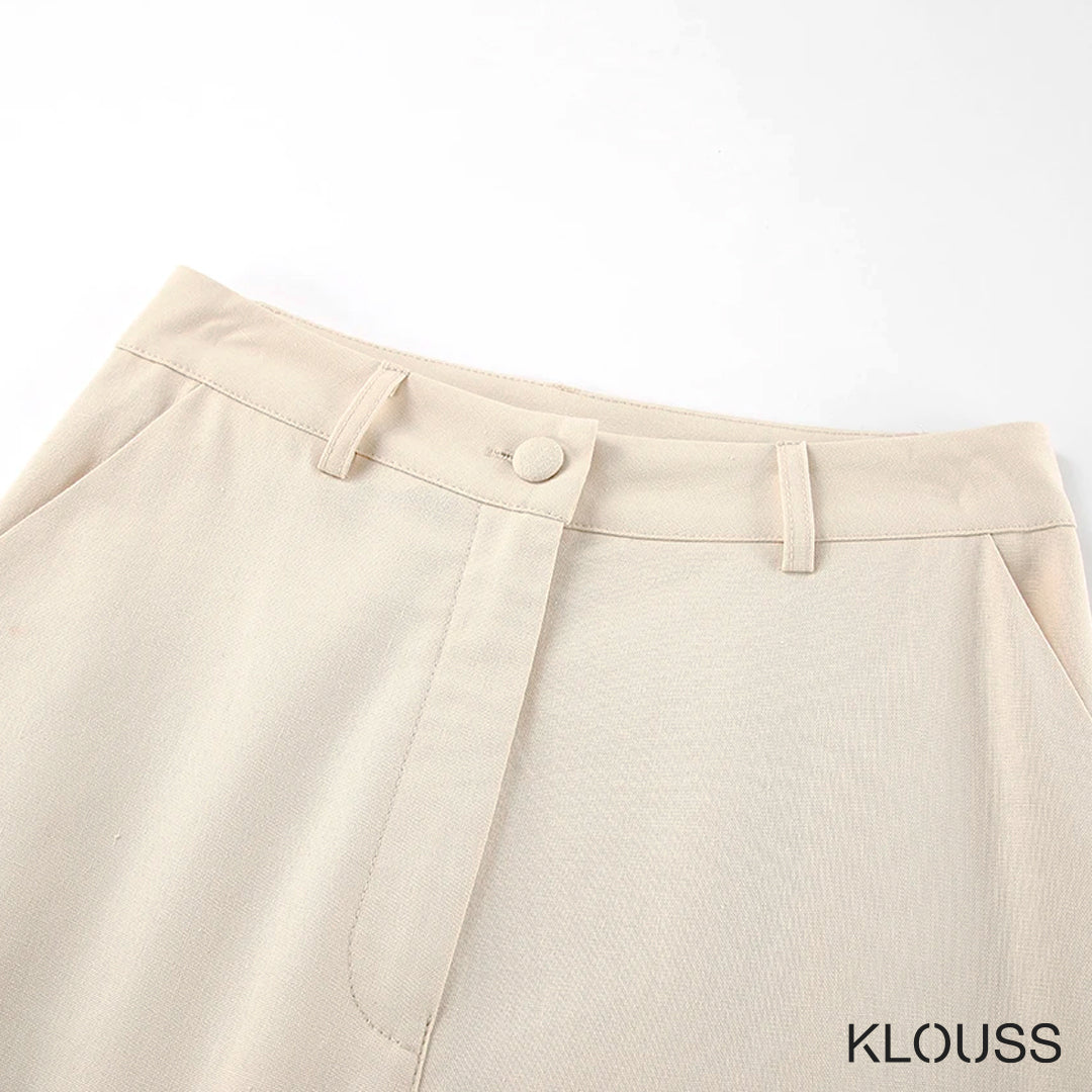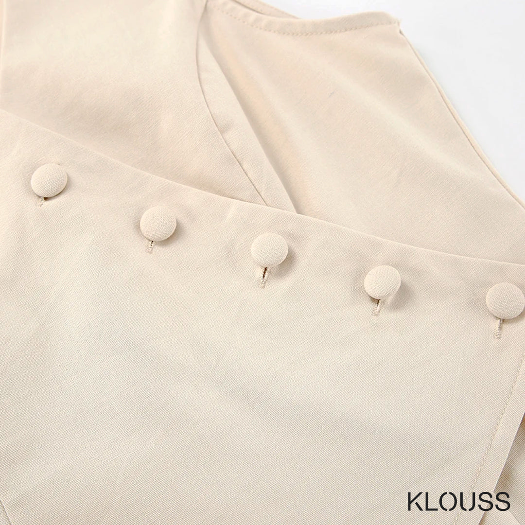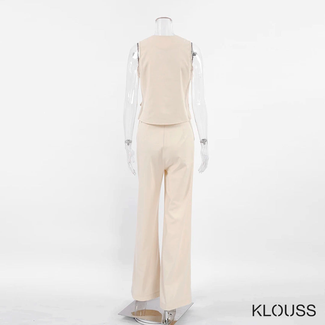Conjunto de dos piezas para mujer con top tipo vest con botones cruzados y cuello en "v" y pantalones largos de pierna ancha. Ideal para la oficina ¡Te vas a ver regia! Disponible en blanco y negro.