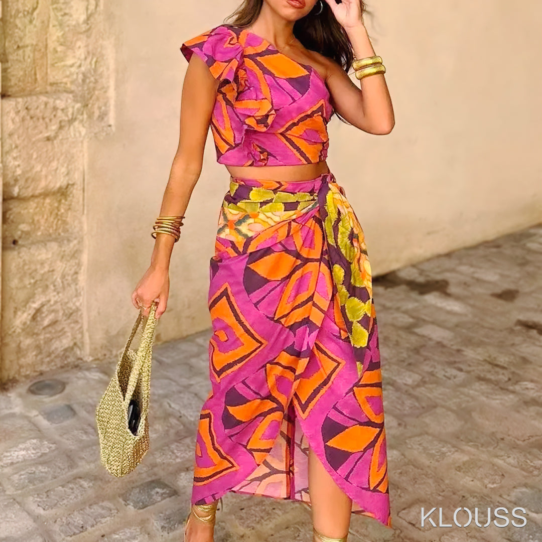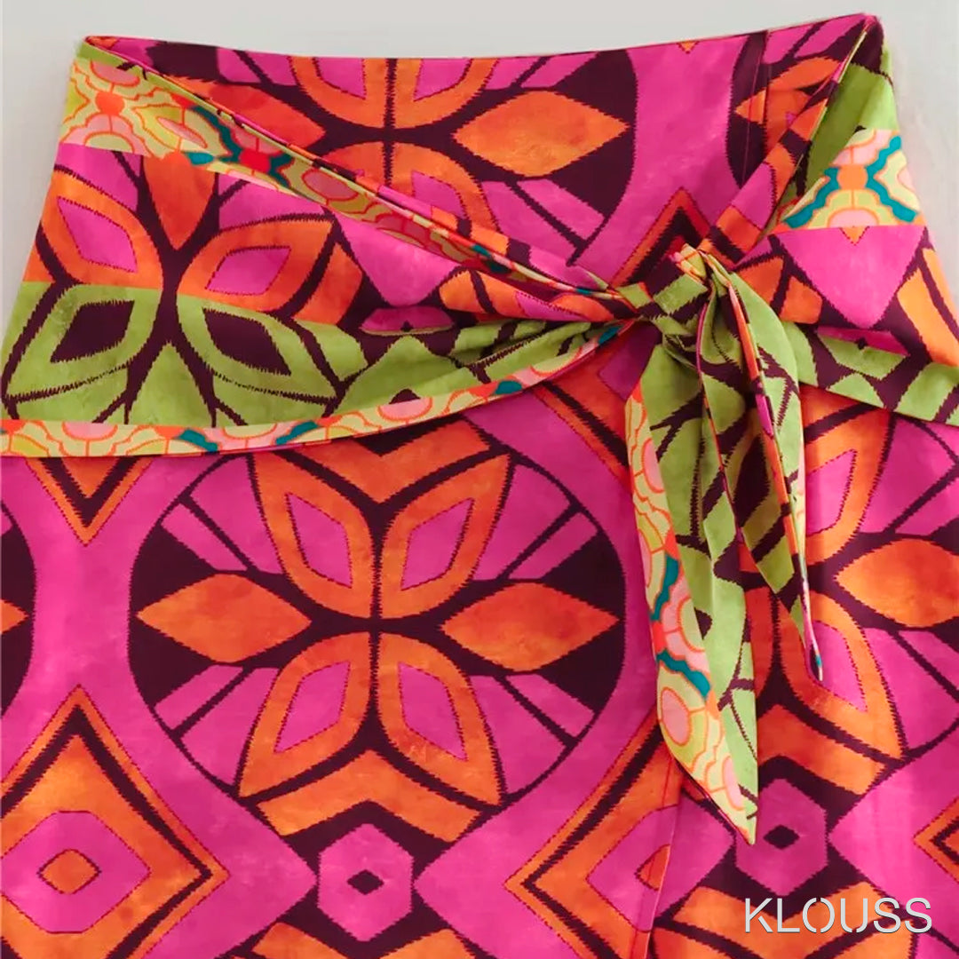 Precioso conjunto veraniego para mujer compuesto por un top sin mangas y una falda larga. Ideal para la playa, piscina o donde quieras en el verano. ¡Te vas a ver regia!