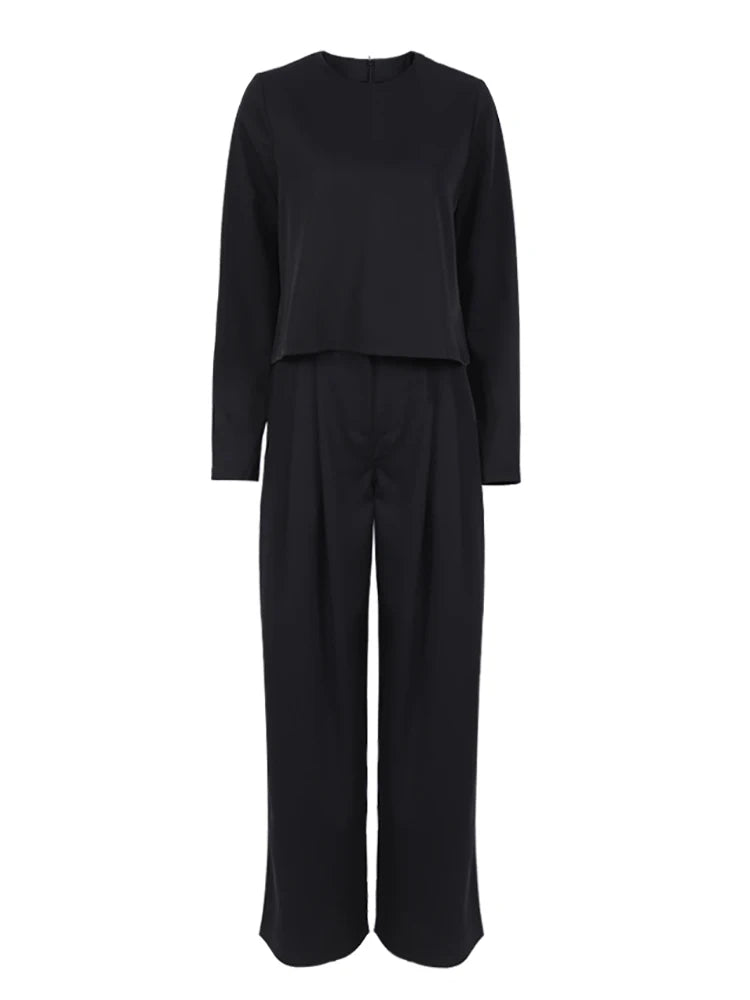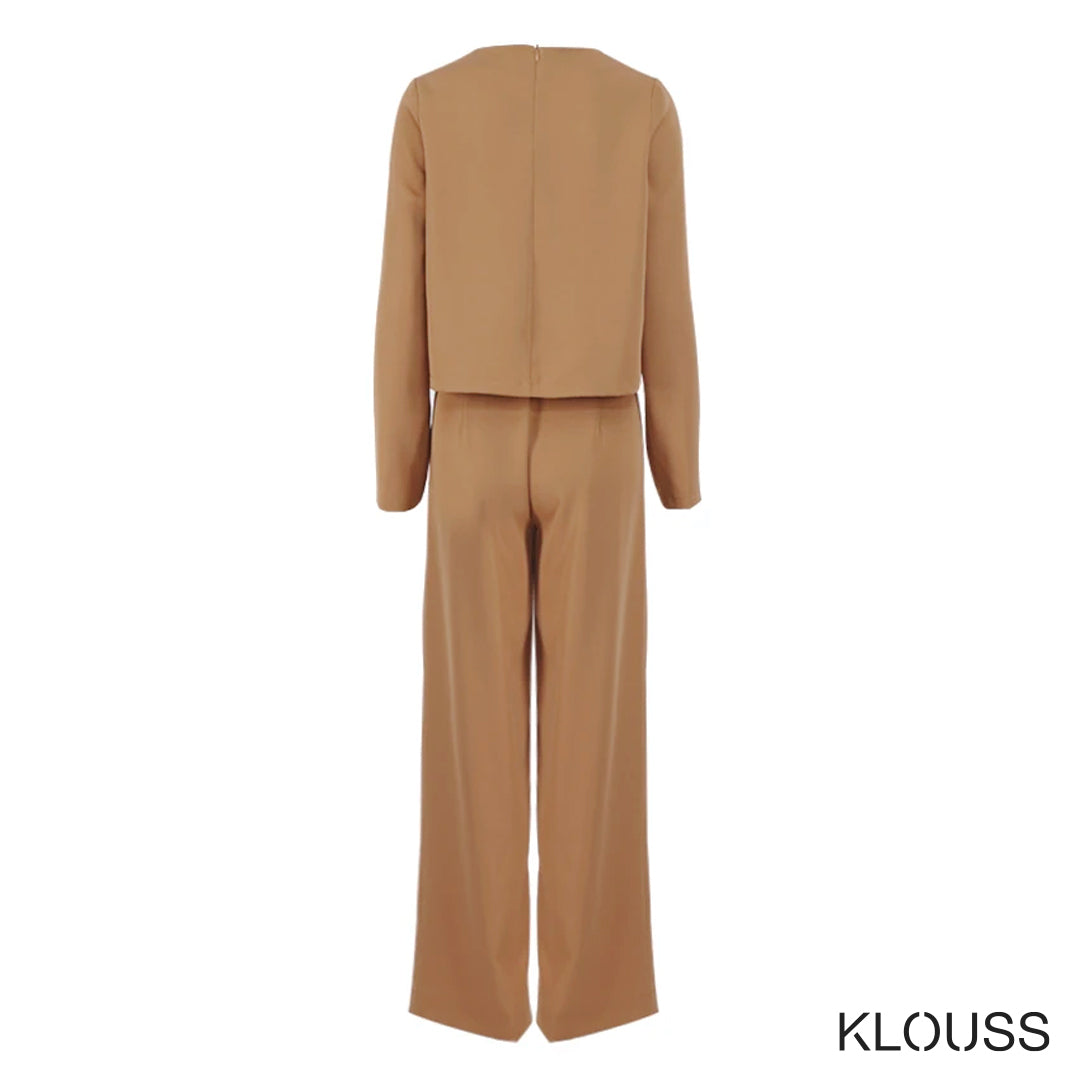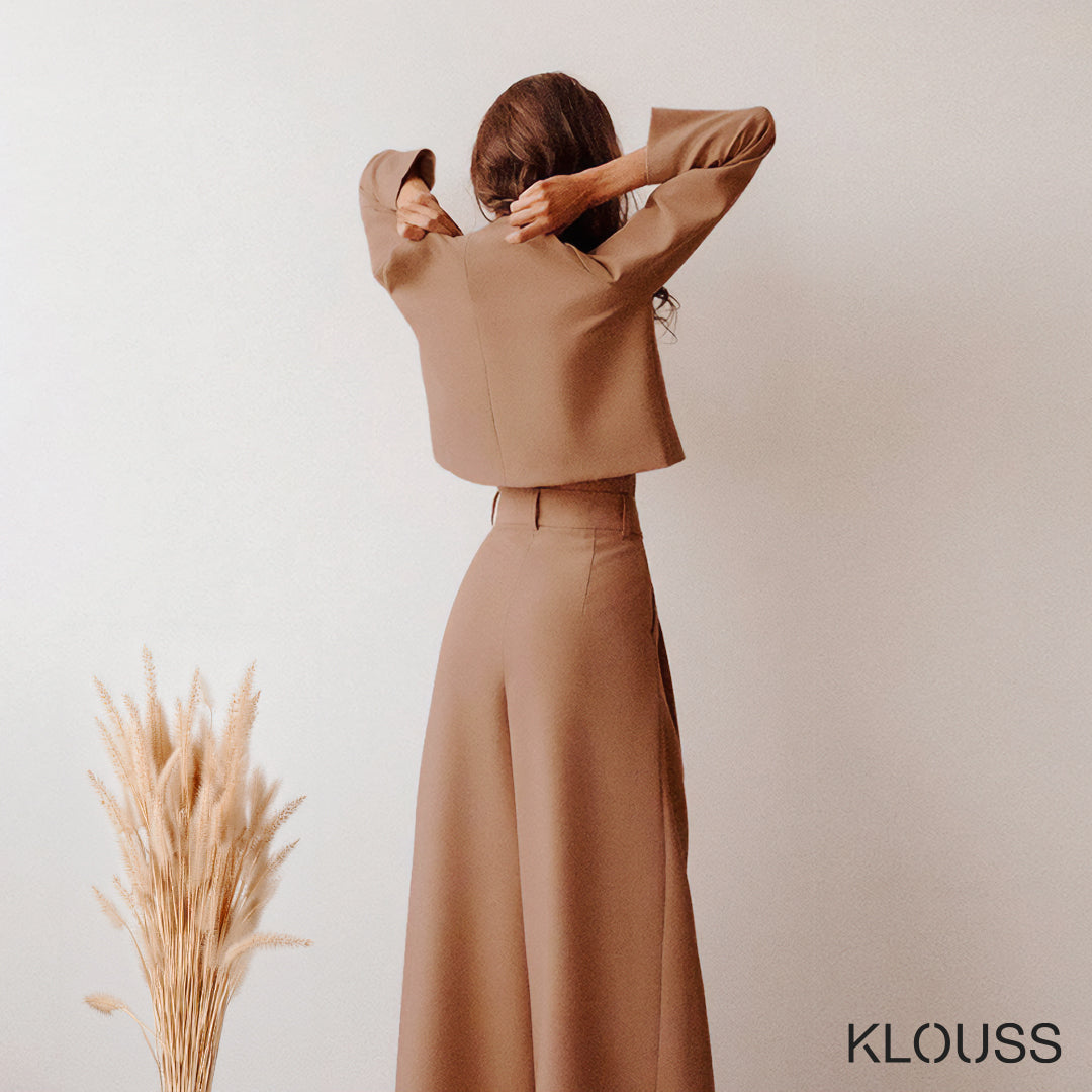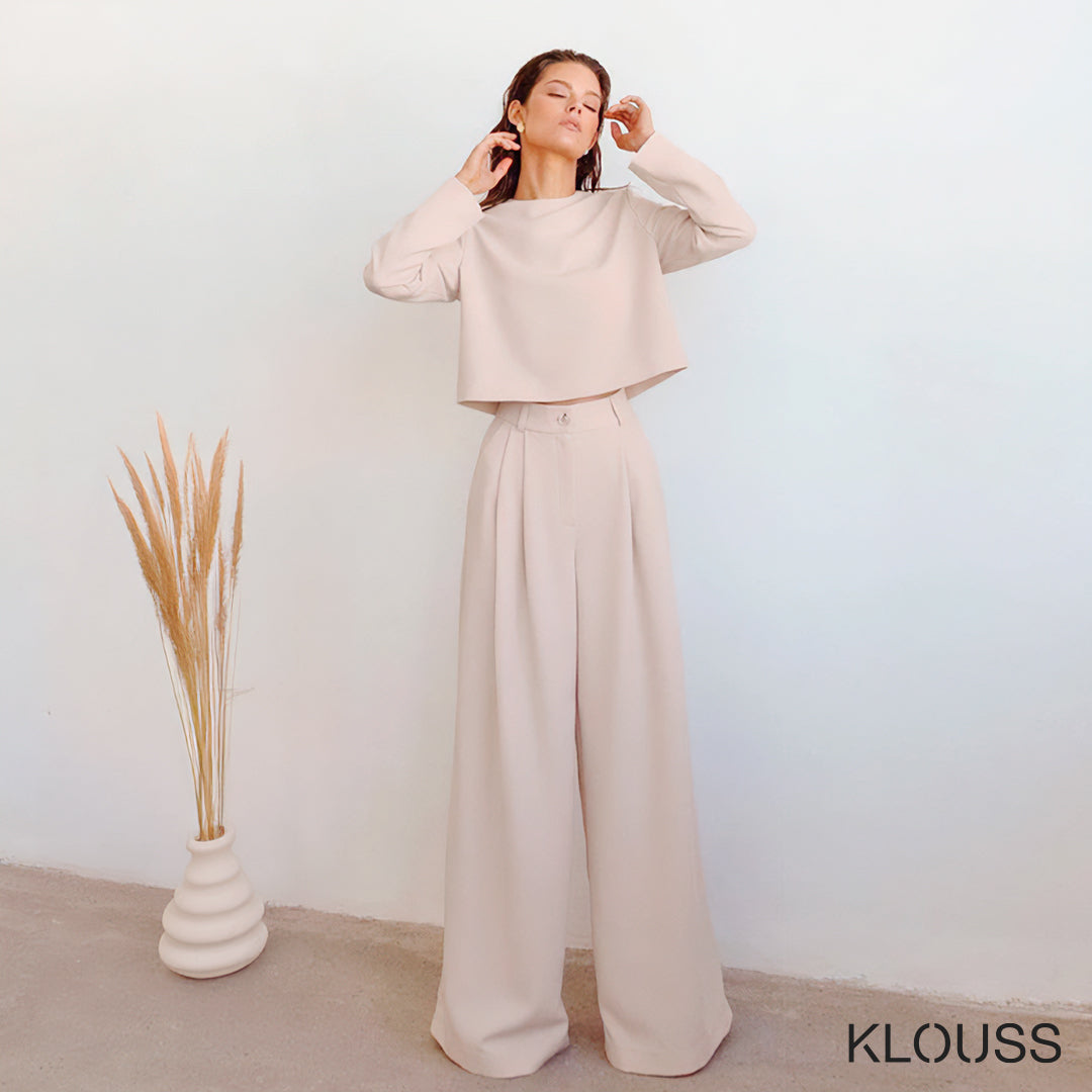 Precioso conjunto para mujer compuesto por un top de manga larga con cierre metálico en la parte trasera y unos pantalones de pierna ancha. De tela gruesa ideal para el frío ¡Te vas a ver espectacular!