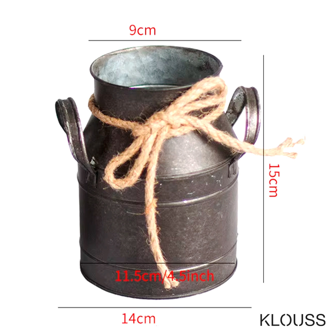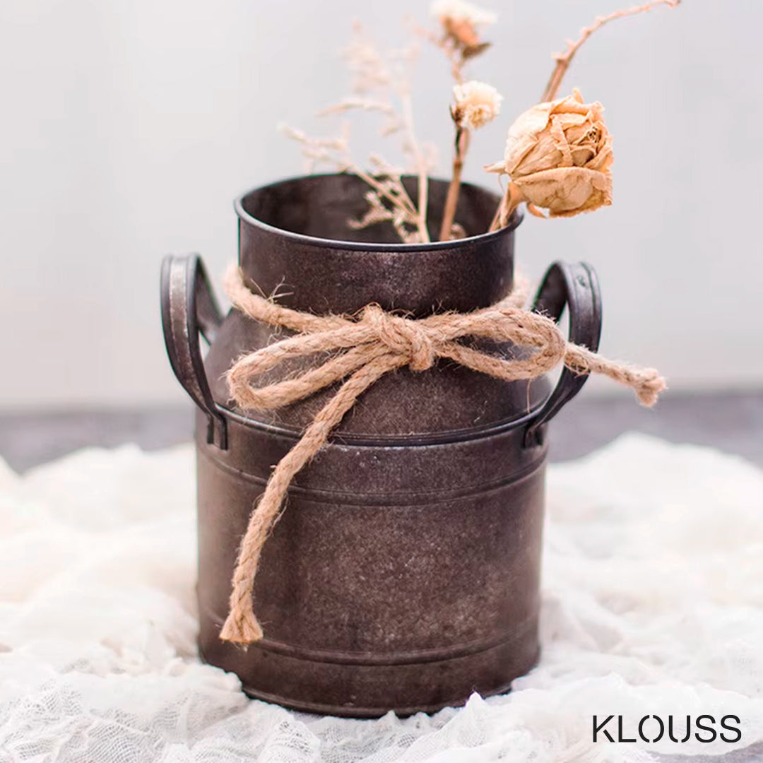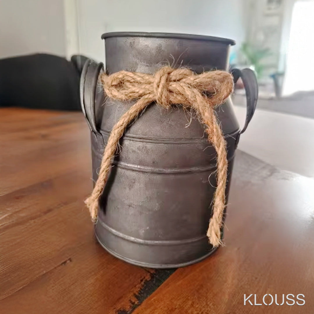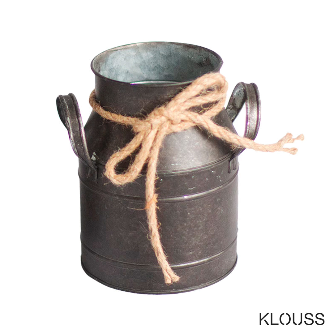Jarrón de estilo retro de hierro envejecido, ideal como accesorio de decoración, con forma de lata de leche vintage. Ideal como adorno de escritorio, sala de estar o cualquier parte del hogar. Además adornado con una cuerda en el cuello con una cuerda.