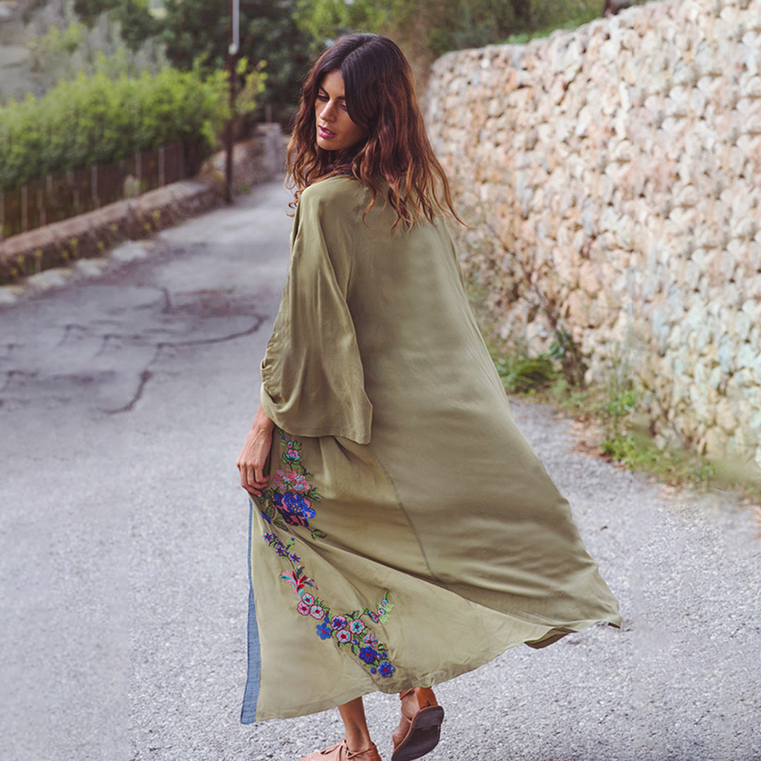 Lindo Kimono Playero, ideal como salida de baño, de tono verde oscuro con flores bordadas ¡Te va a encantar!