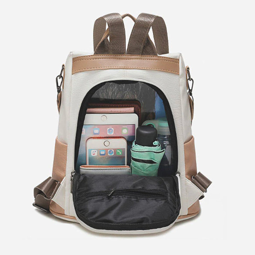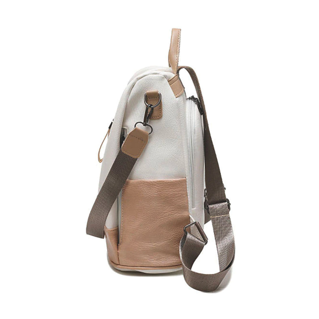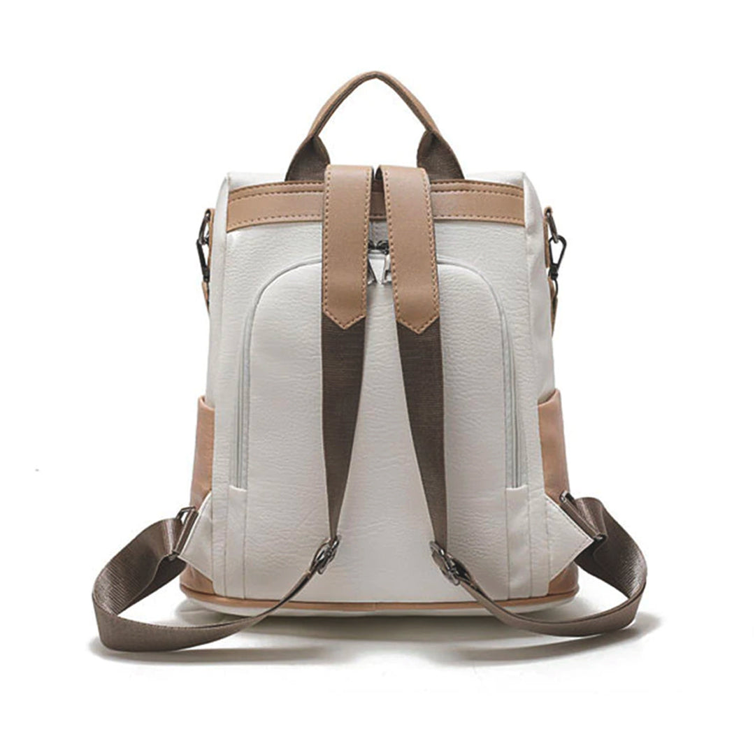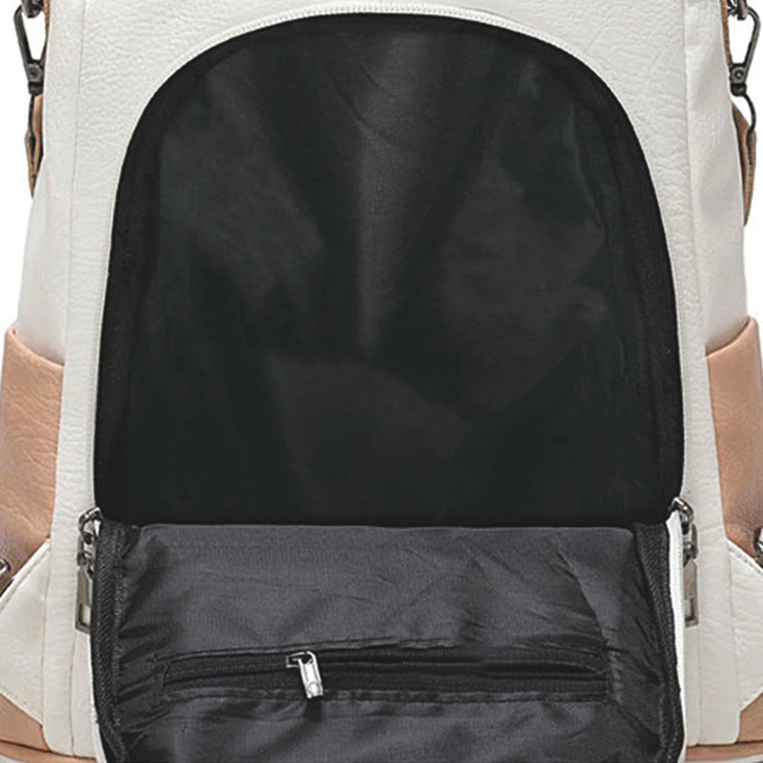 Linda mochila de cuero diseñada en todos claros y con bolsillo antirrobo y espacios adicionales para tus anteojos, botella y billetera. ¡Te encantará!