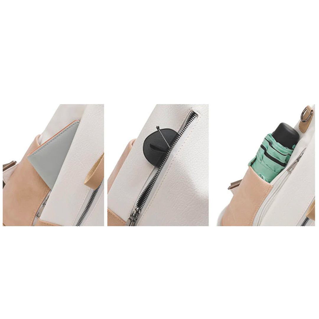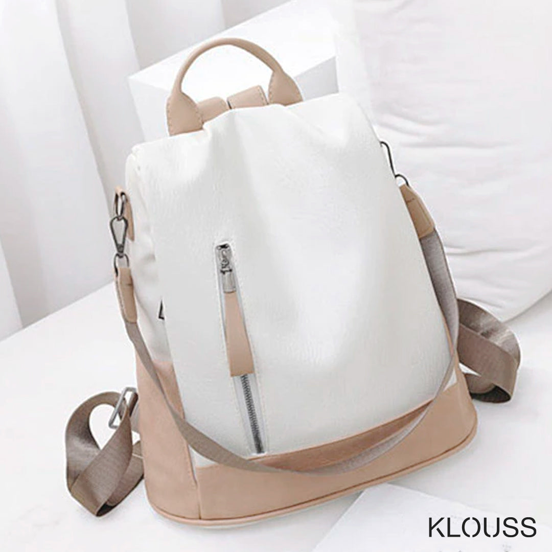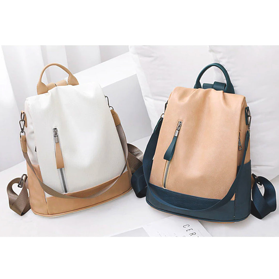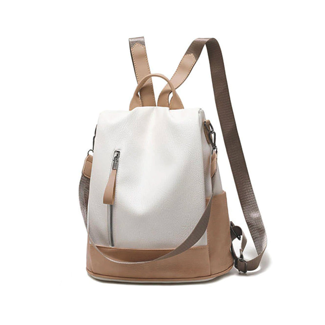 Linda mochila de cuero diseñada en todos claros y con bolsillo antirrobo y espacios adicionales para tus anteojos, botella y billetera. ¡Te encantará!