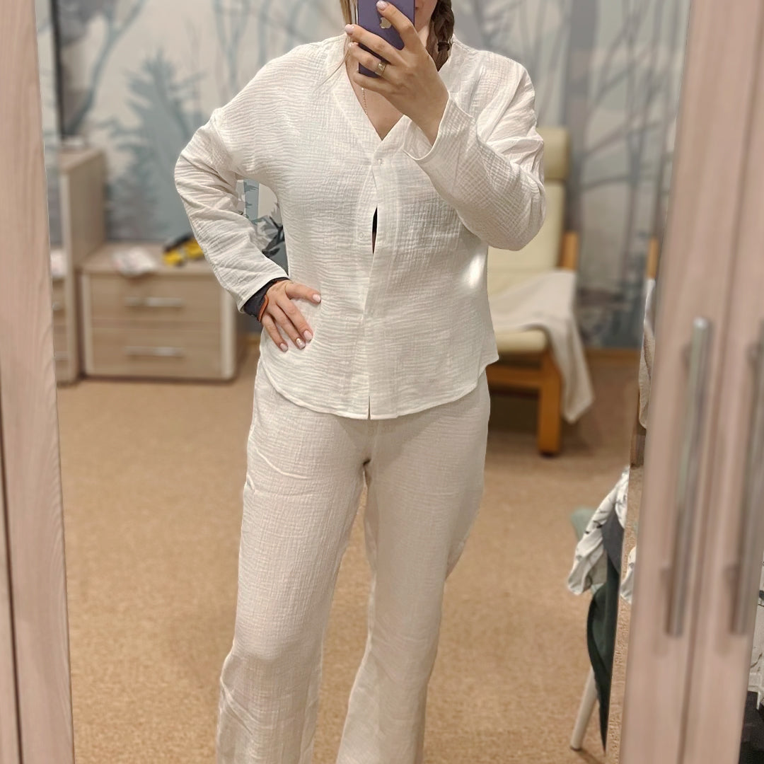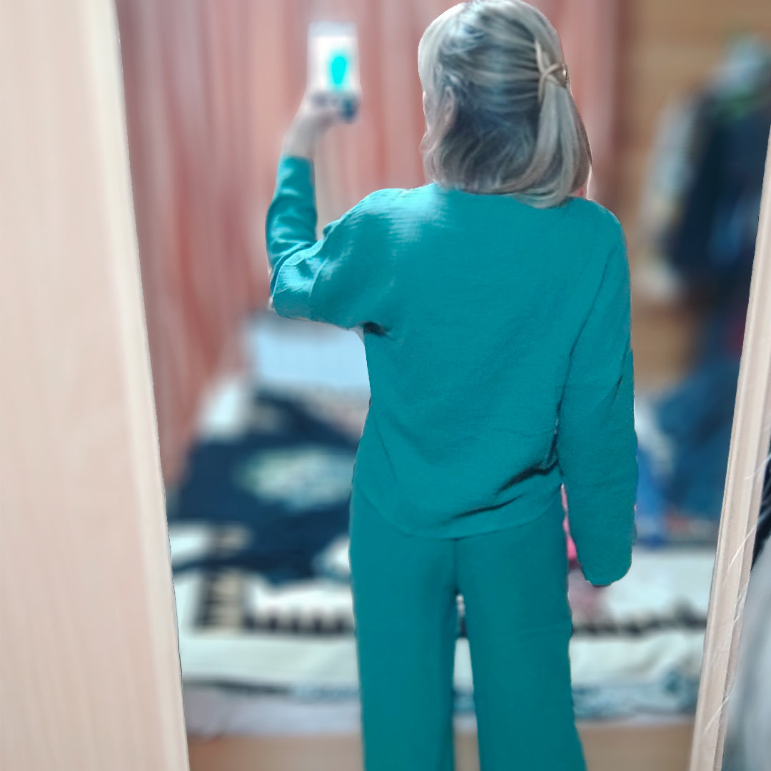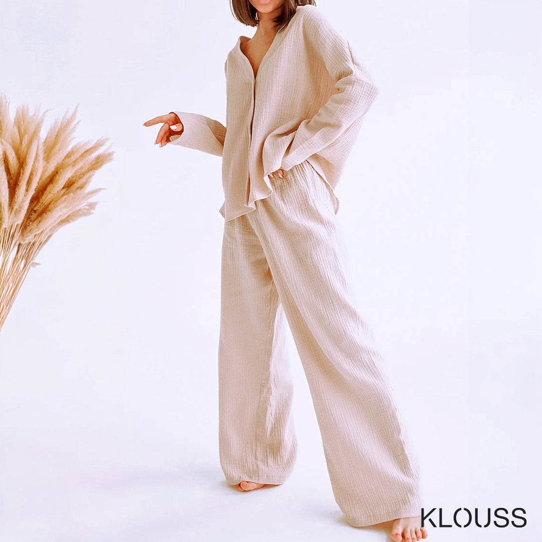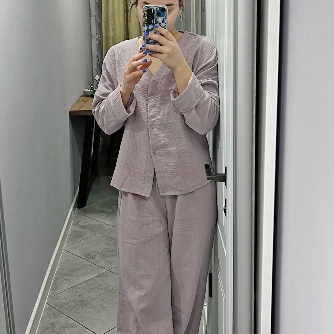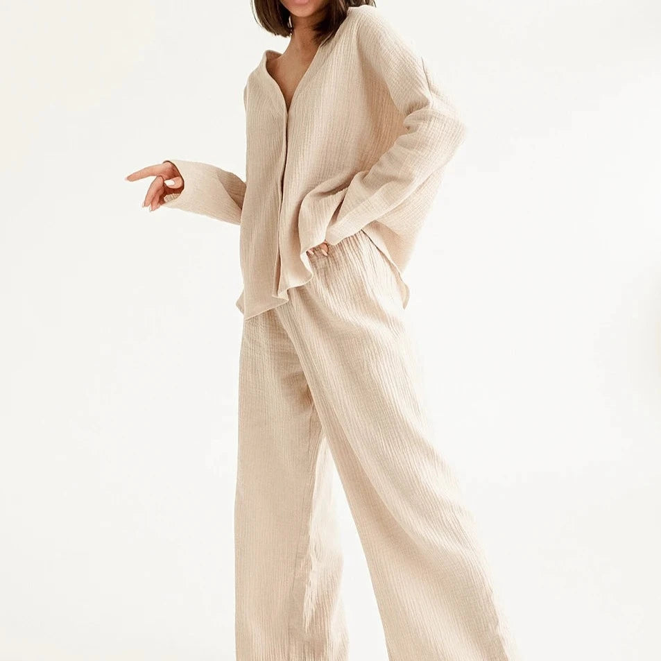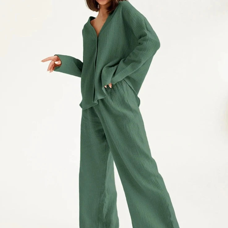 Espectacular pijama largo para mujer de cuello en "v" cerrado con botones y pantalones anchos de cintura elasticada. Ideal para el invierno y otoño ¡Te va a encantar!