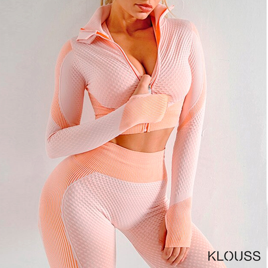 Espectacular conjunto deportivo para mujer, disponible de 2 y 3 piezas. Incluye un polerón corto, sport bra y leggings. Disponible en lindos colores de tela elástica y transpirable ¡Lo vas a amar!