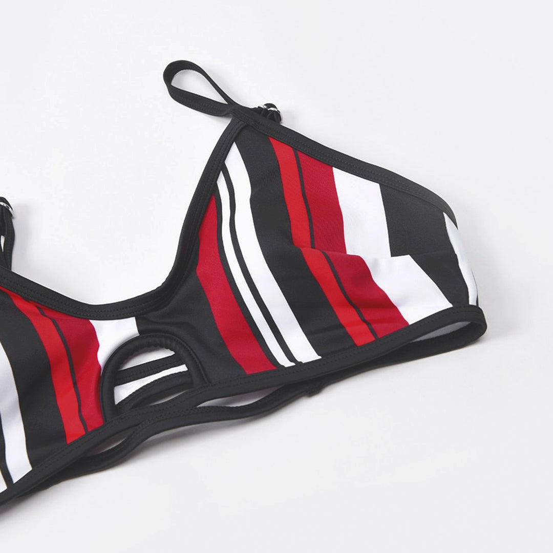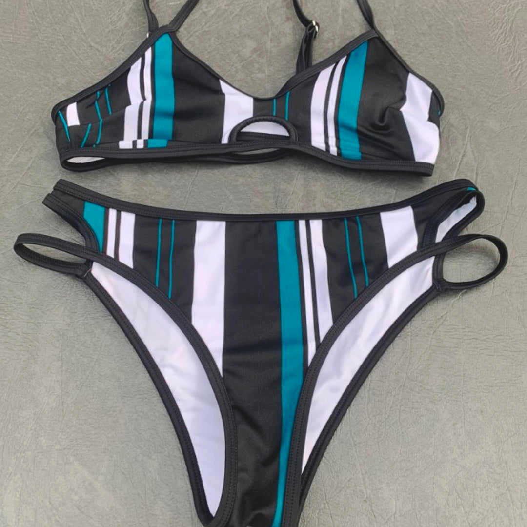 Lindo Bikini de 2 piezas de rayas blancas y negras de base y un tercer color para combinar. El top tiene espaldas de tirantes y los hombros son ajustables y el calzón con un juego de tiras de decoración ¡Te verás estupenda!