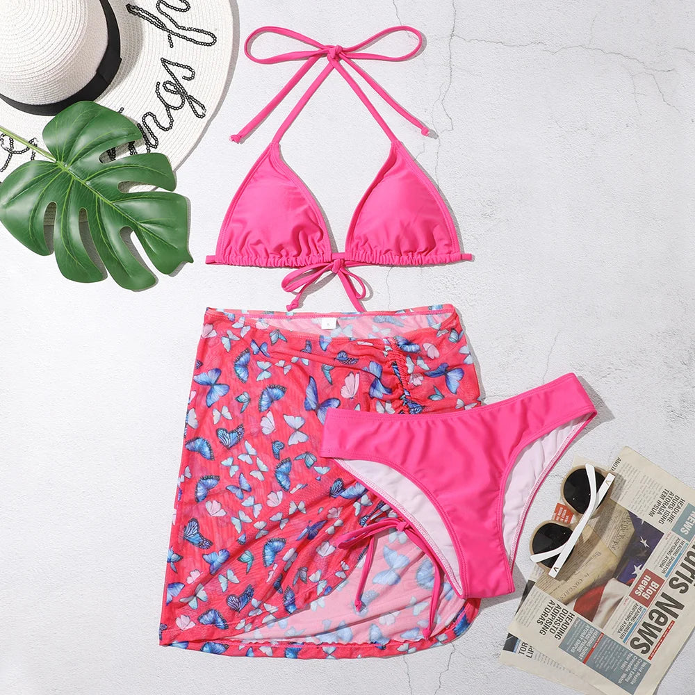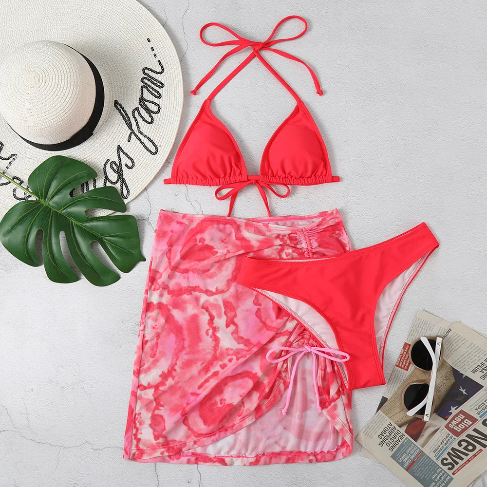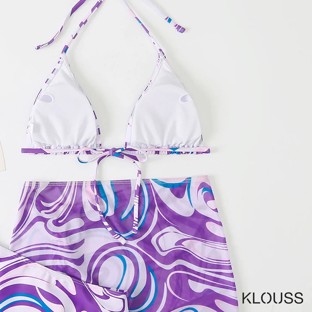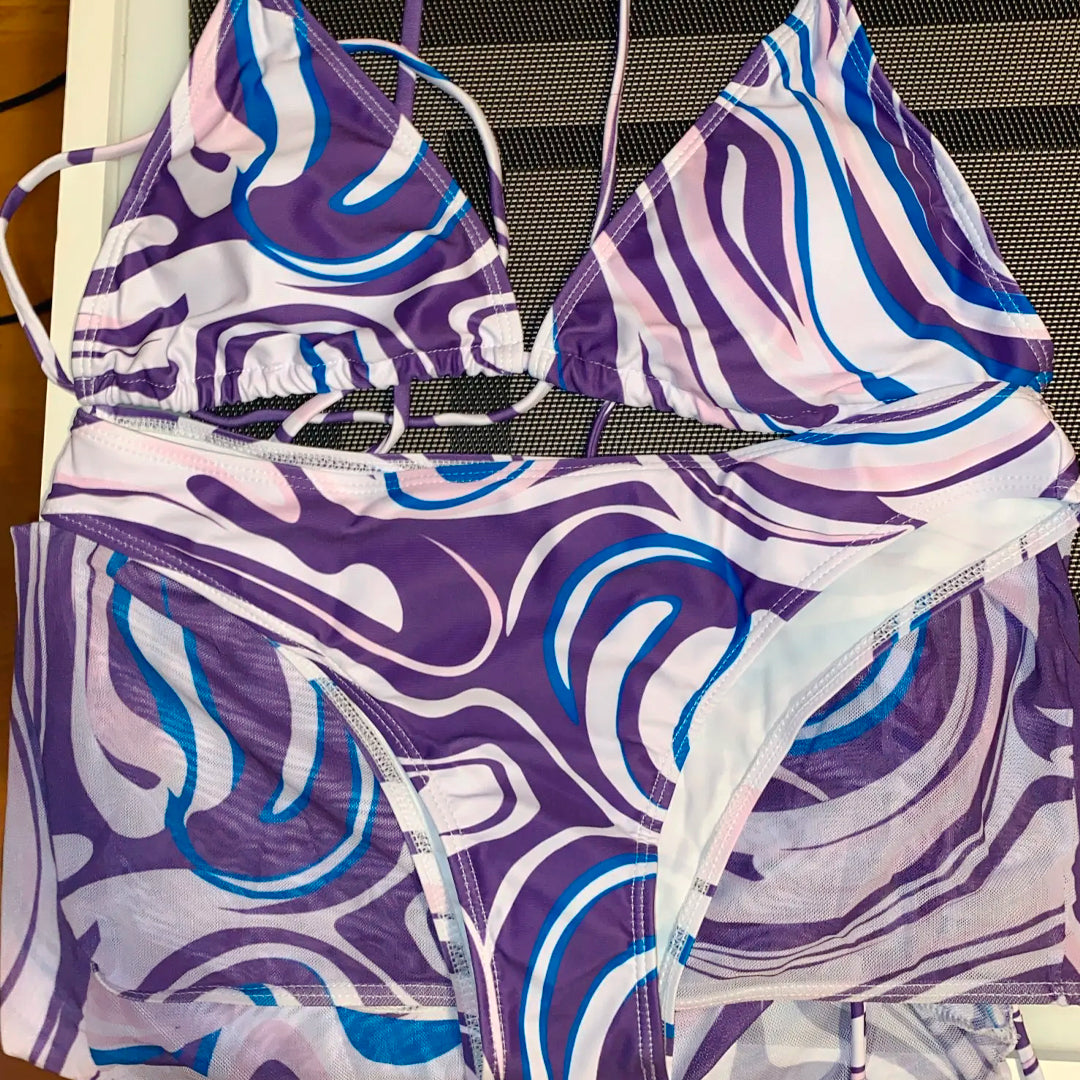 Precioso conjunto de bikini para mujer de tres piezas. Incluye pareo, top y calzón. Ideal para ir a la playa o usarlo en la piscina. ¡Te va a encantar!