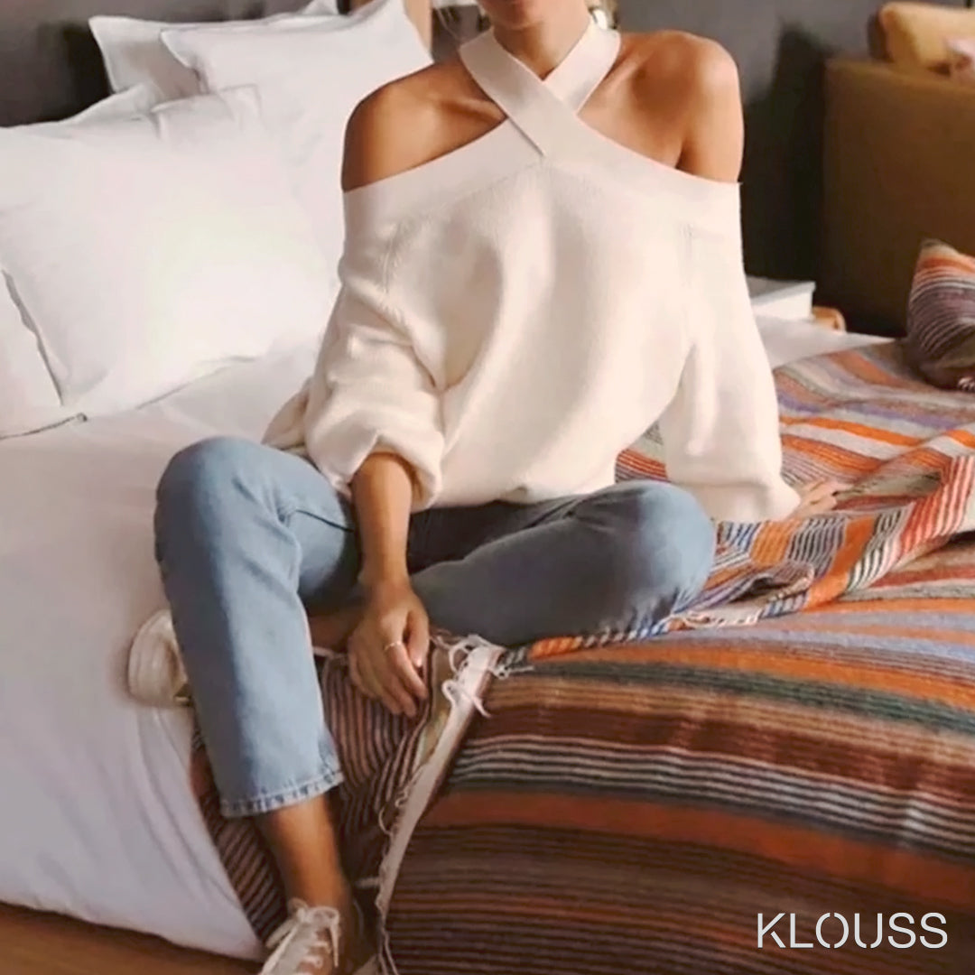 Lindo y exclusivo sweater con cuello cruzado y hombros descubiertos. ¡Te verás estupenda!