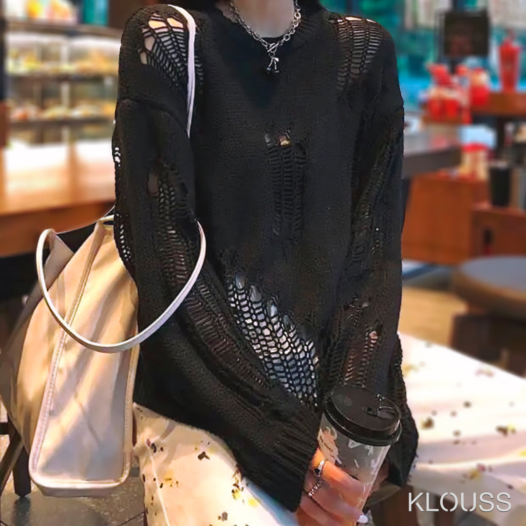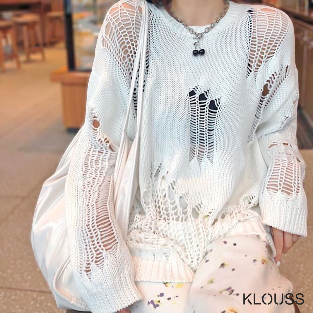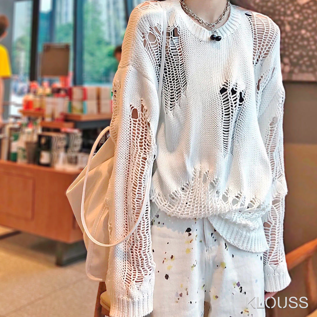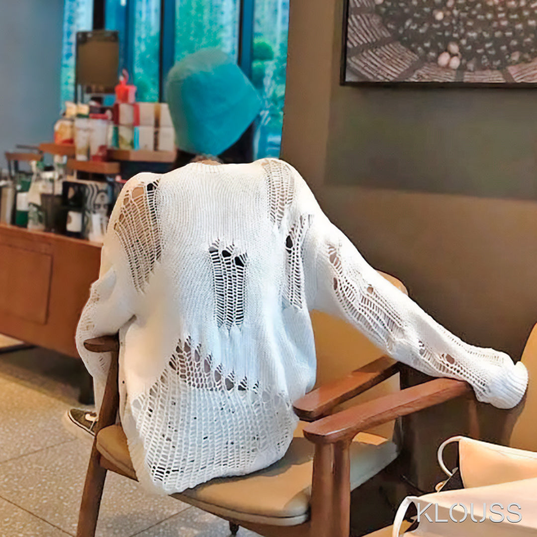 Taquillero Sweater para mujer de puntos calados "rotos" de manga larga disponible en colores blanco y negro. ¡Te va a encantar!