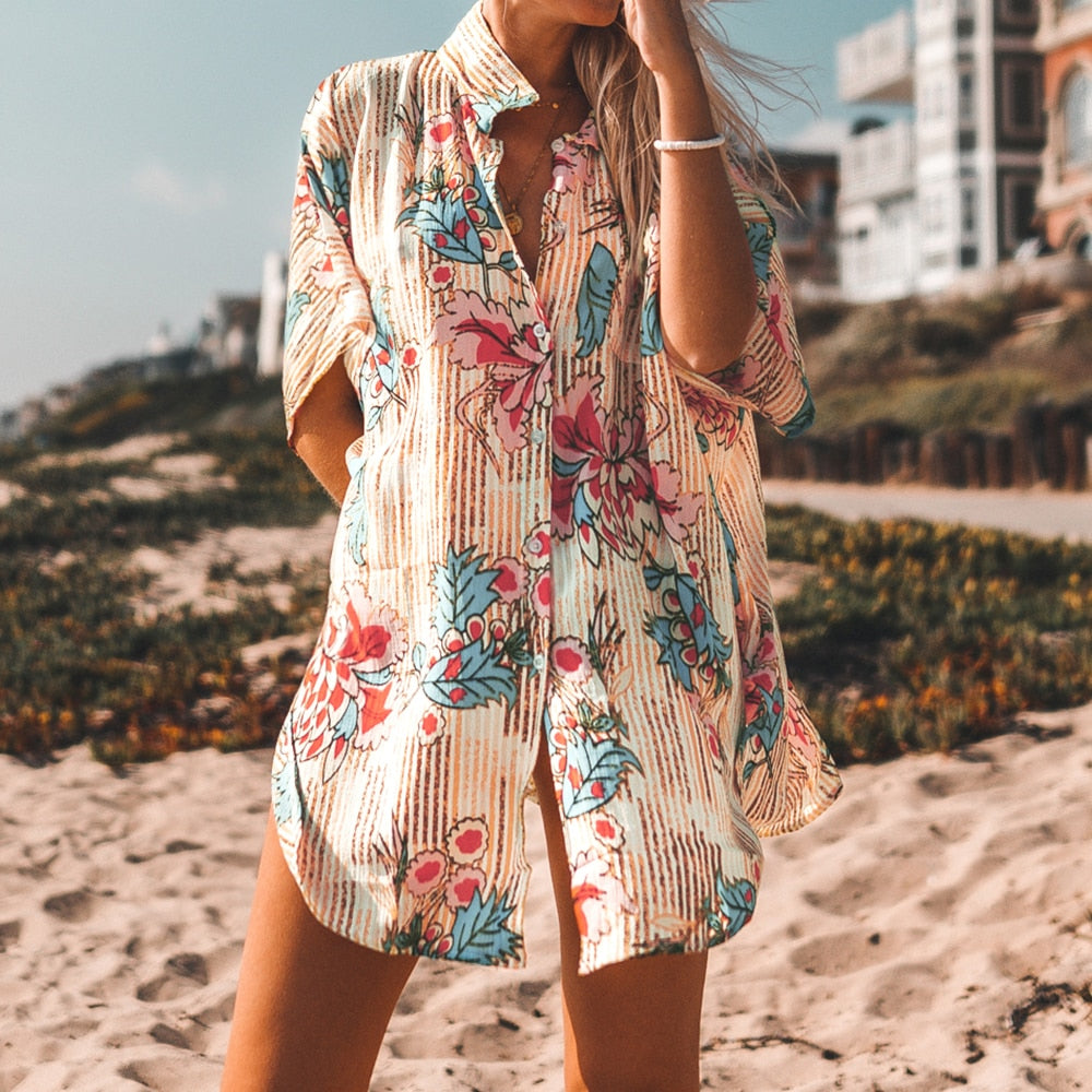 Lindo vestido camisero, tipo salida de baño, con diseño floreado tipo playero ¡Muy taquillero!