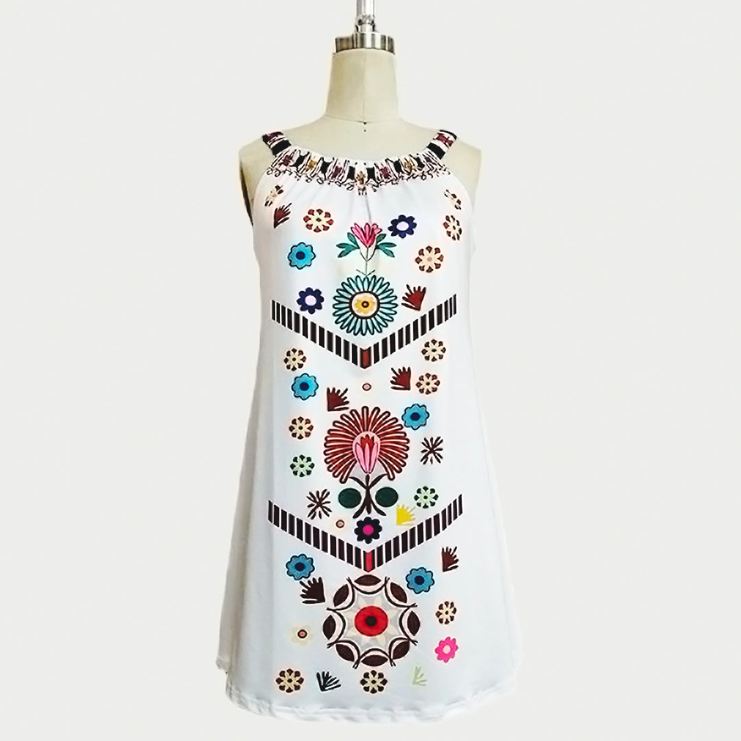Lindo vestido playero, tipo salida de baño, blanco con diseño veraniego de cuello redondo sin mangas. Ideal como salida de baño. ¡Te verás estupenda!