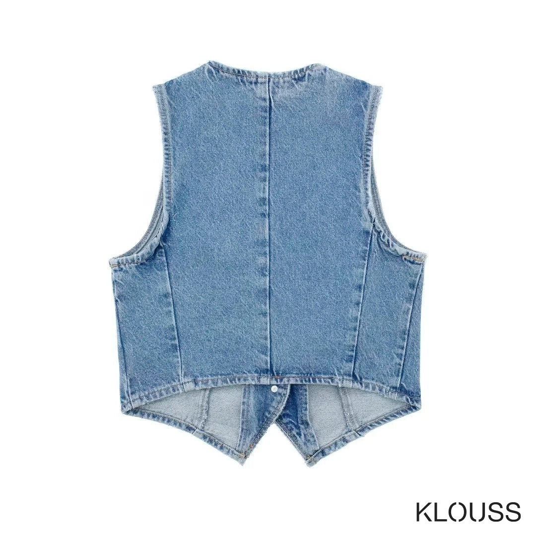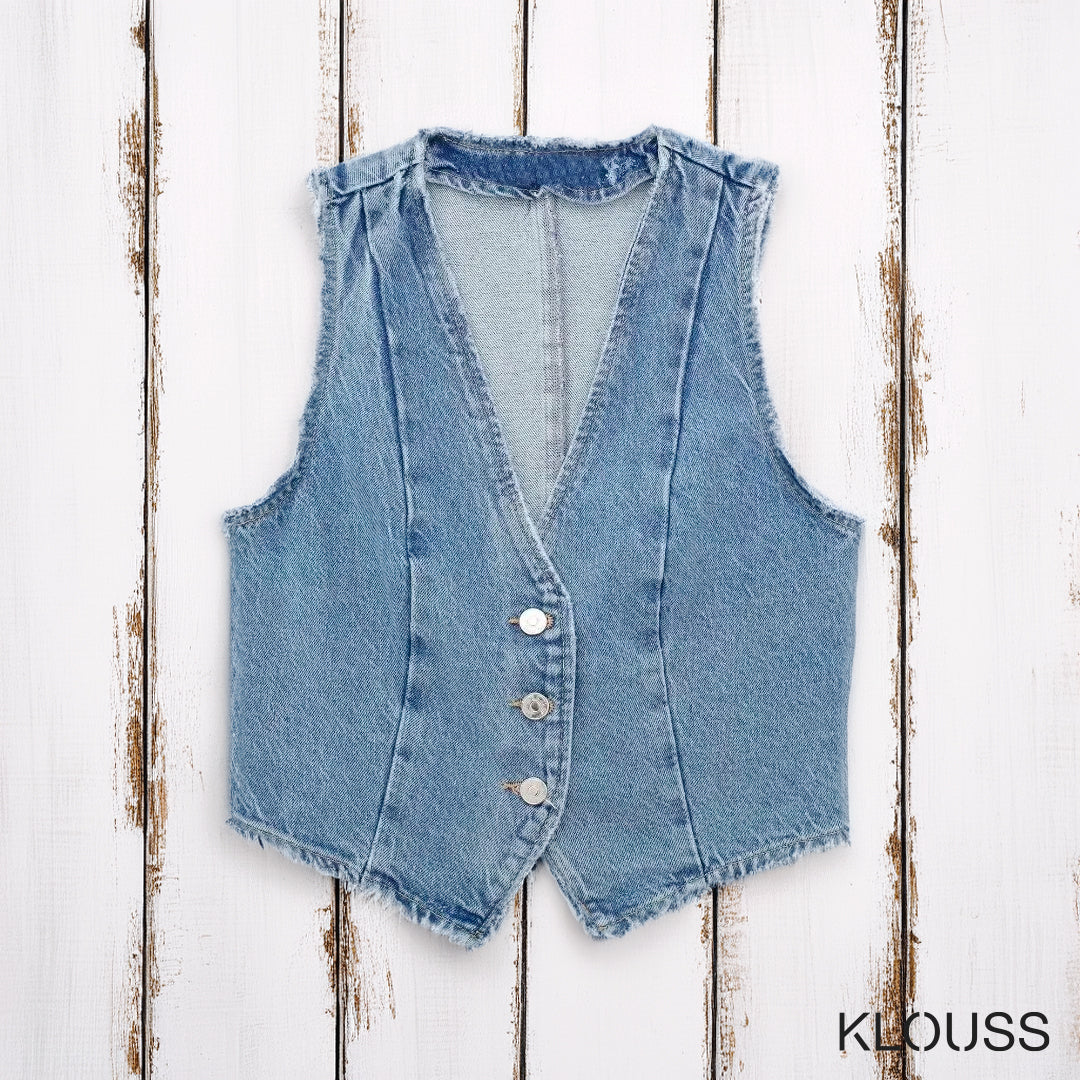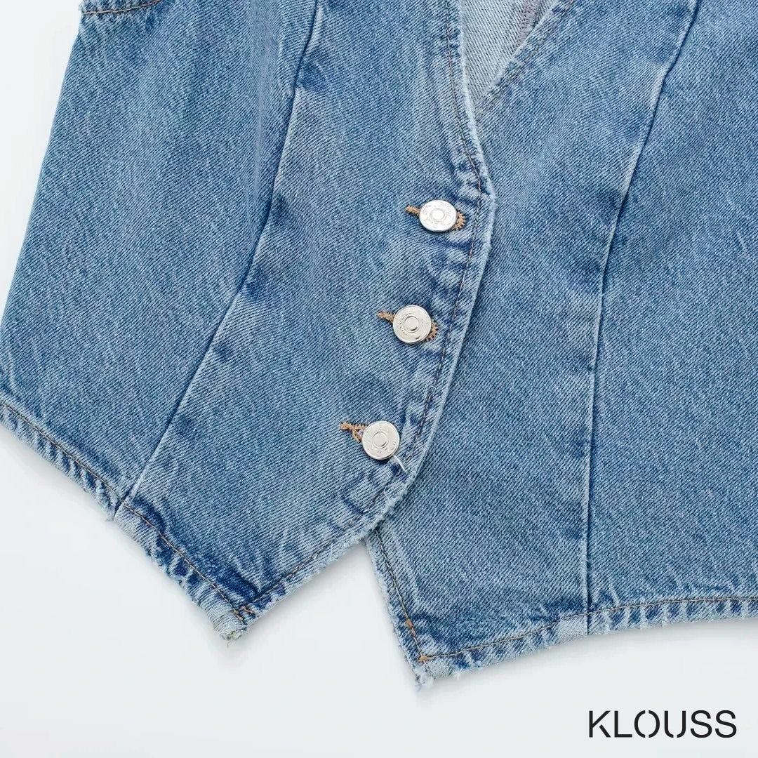 Taquillera chaqueta de Jean sin mangas ajustada, tipo vest, de escote en "V" ideal para primavera y verano ¡Te vas a ver regia!