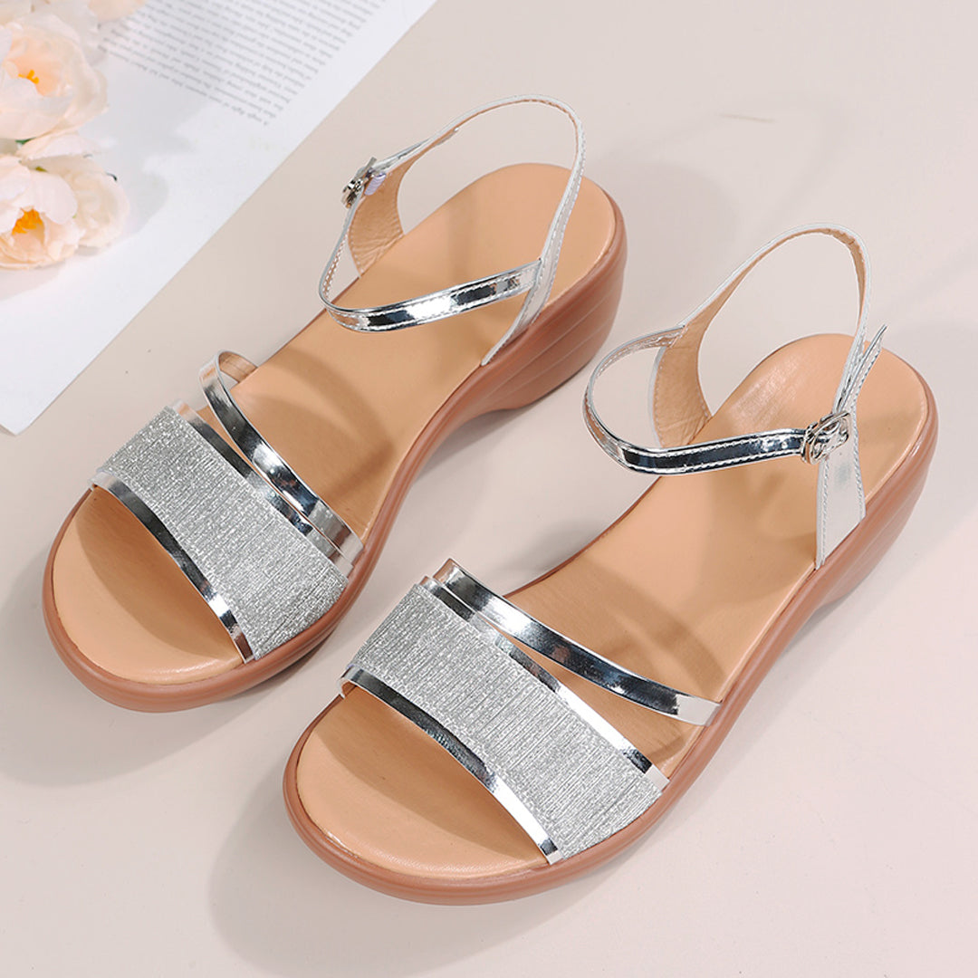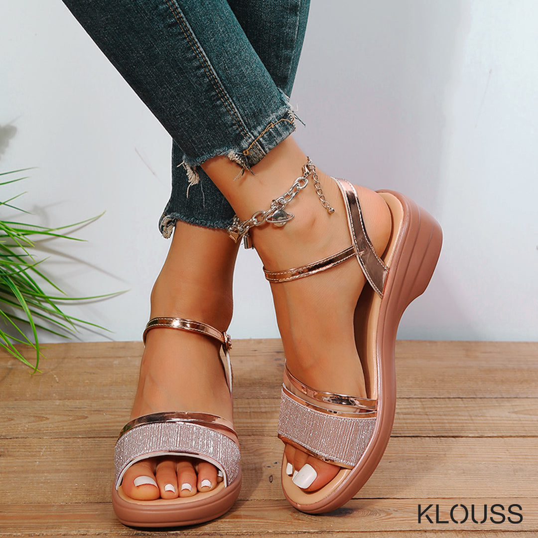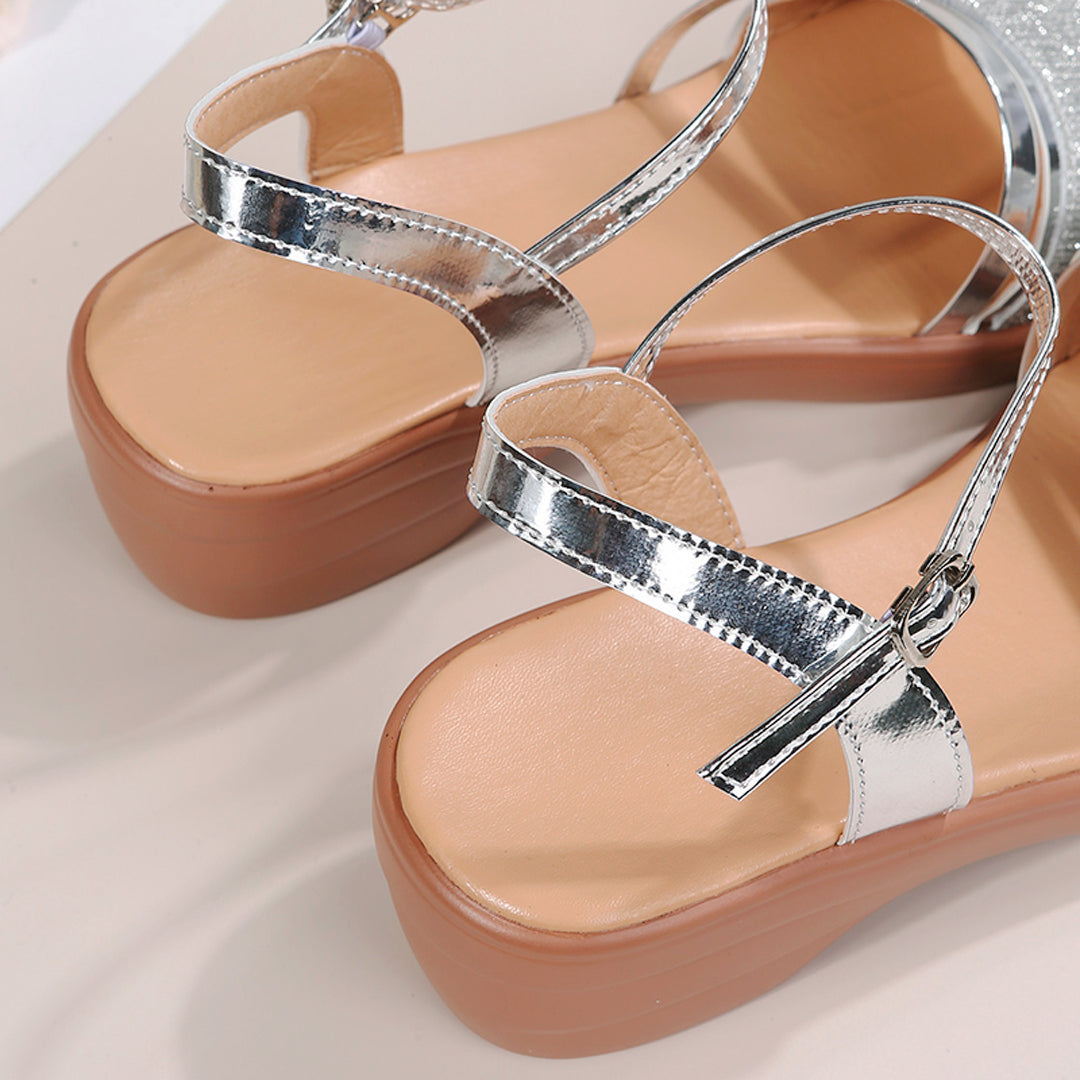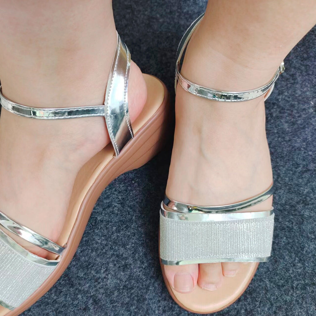 Lindas sandalias para mujer de plataforma gruesa y de cuña disponible en dorado y plateado.