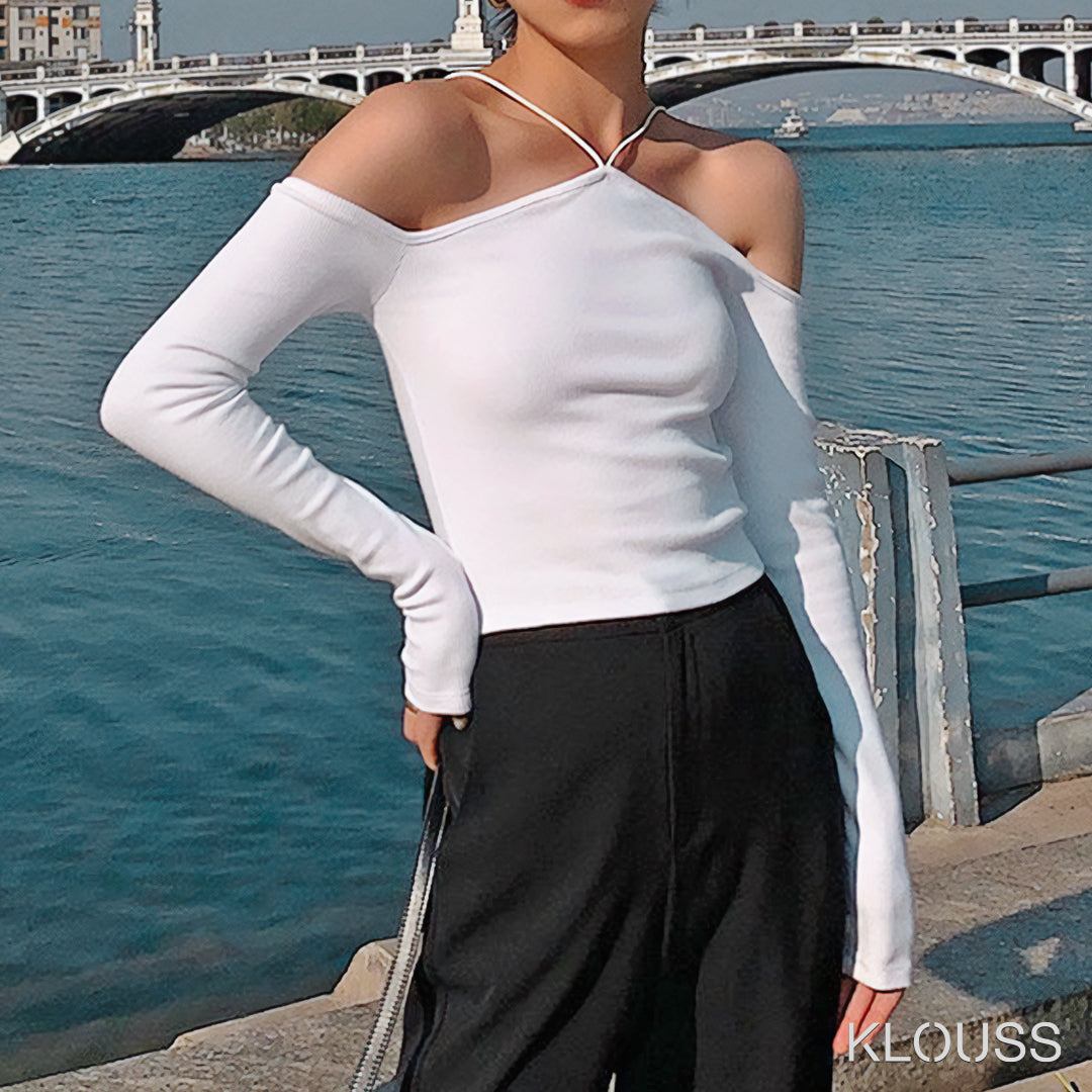 Lindo sweater para mujer delgado con tiritas y hombros descubiertos. De manga larga muy taquillero. ¡Te vas a ver regia!