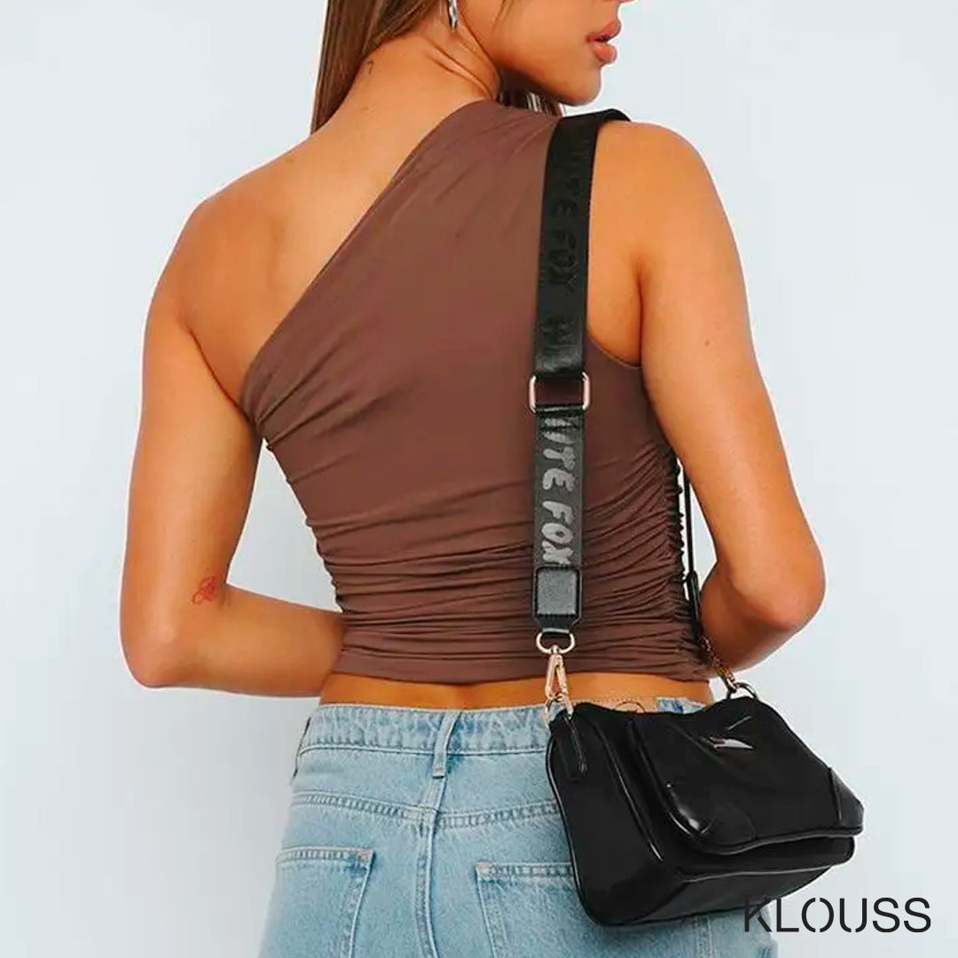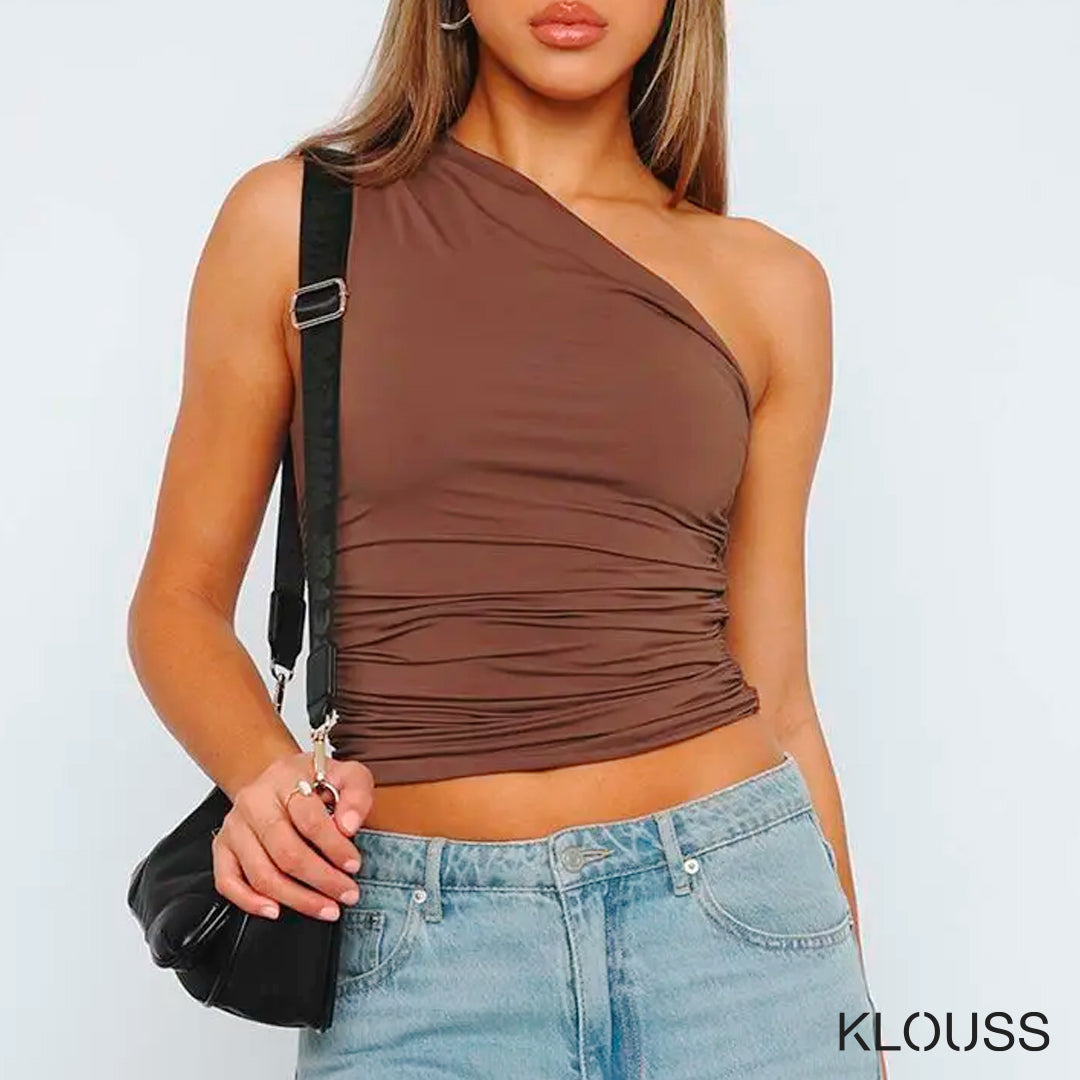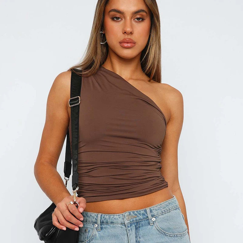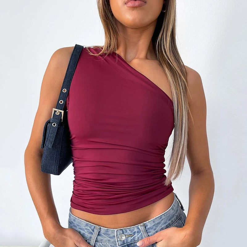 Lindo Top corto, tipo camiseta ajustada para mujer de un solo hombro, sin mangas. ¡Te vas a ver regia!
