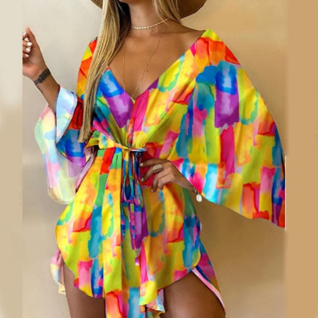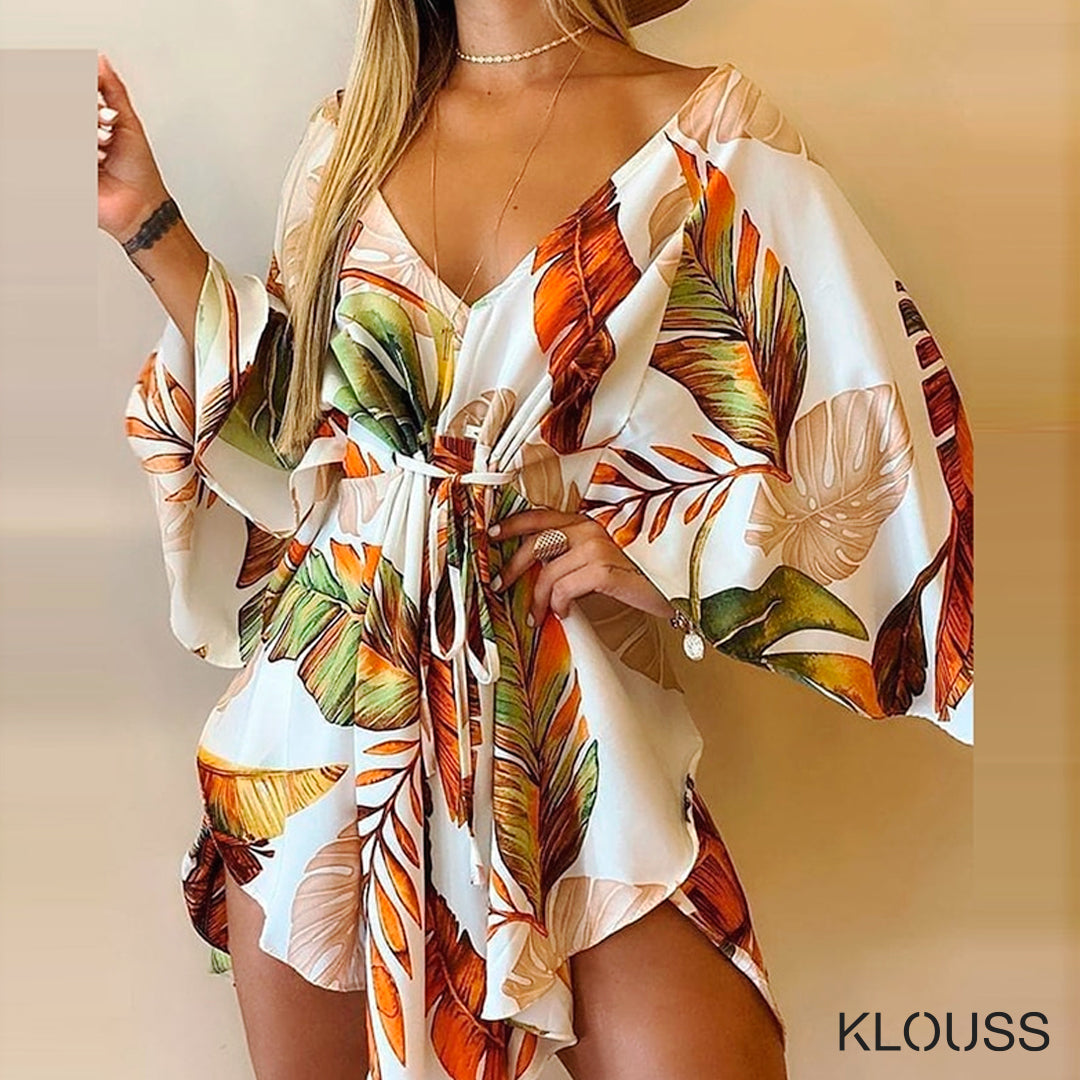 Precioso vestido corto veraniego con estampado floreado o de hojas. Ideal para la playa y como salida de baño. ¡Te va a encantar!