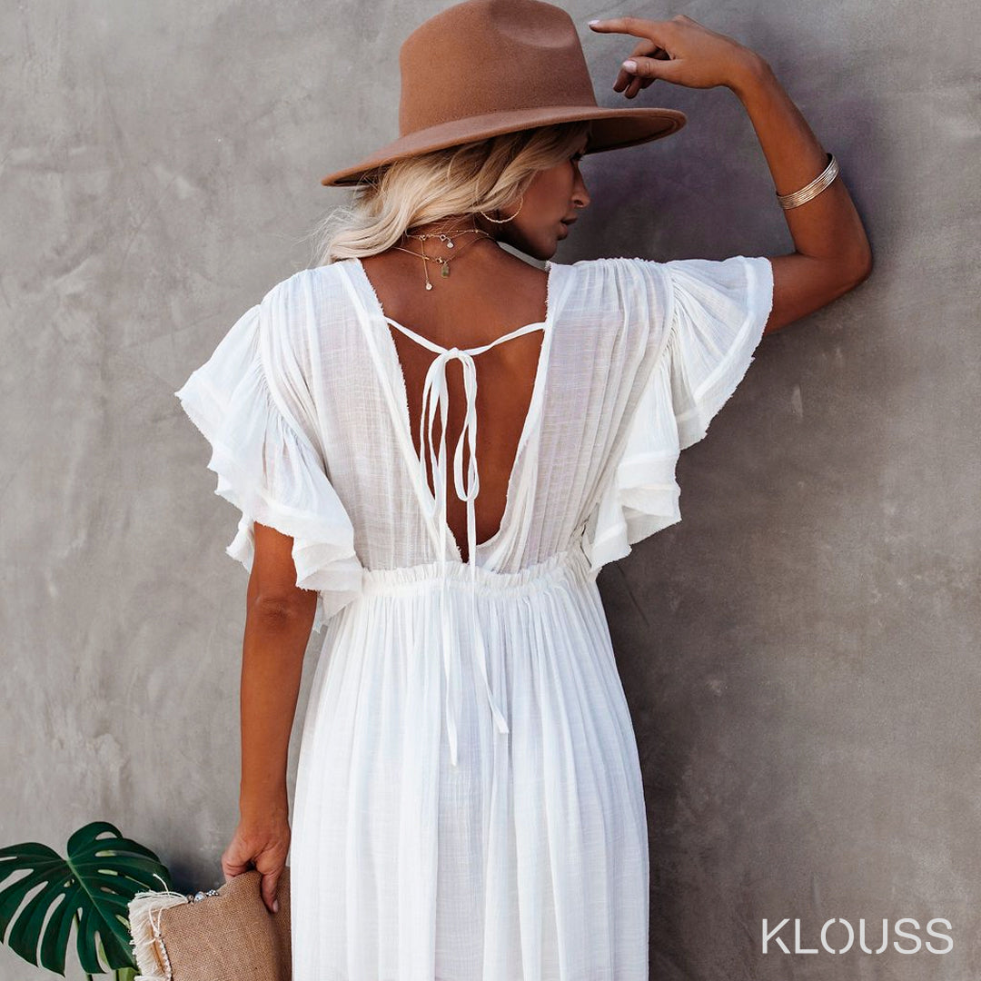 Preciosa salida de baño y cubre bikini tipo vestido de tela fina y delgada. Ideal para la playa y la piscina. Cuenta con cierre de botones y tiritas. ¡Te vas a ver estupenda!